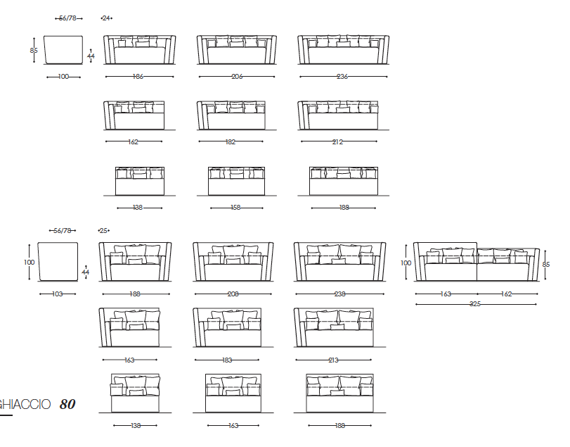 В описании указаны варианты размеров по сиденьям: 2 места, 2 с половиной места и 3 сиденья; также упоминаются модульные версии.