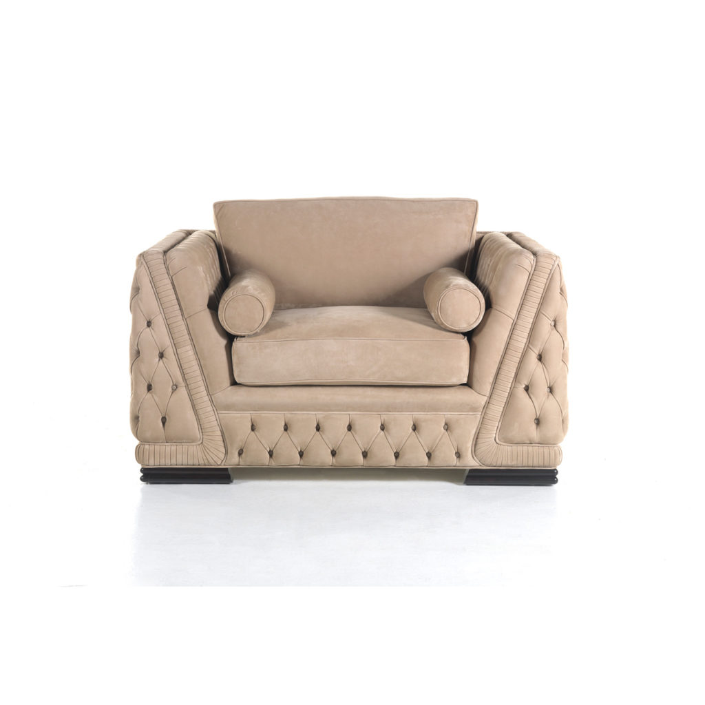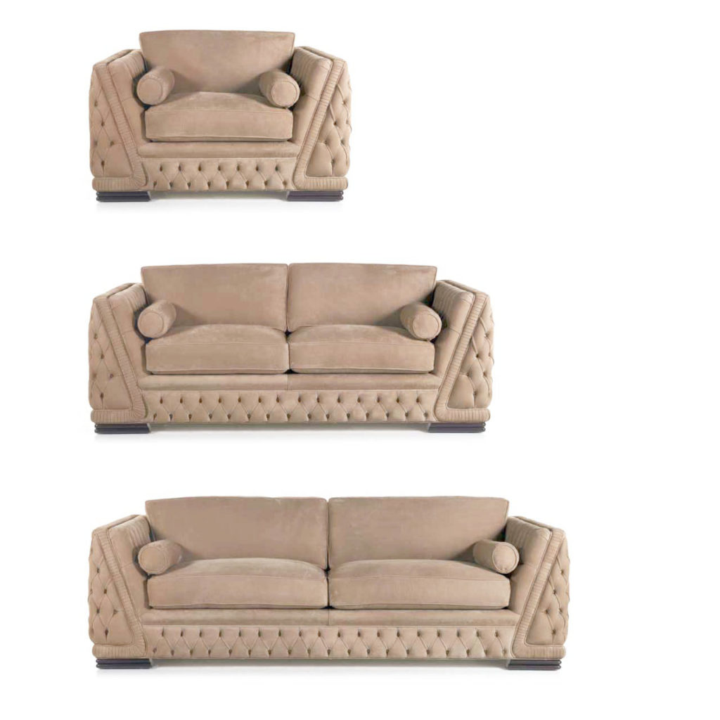 Диван 3‑местный: 244 × 100 × h. 83 см; Диван 2‑местный: 200 × 100 × h. 83 см; Кресло: 130 × 100 × h. 83 см; Пуфик: 65 × 65 × h. 46 см.