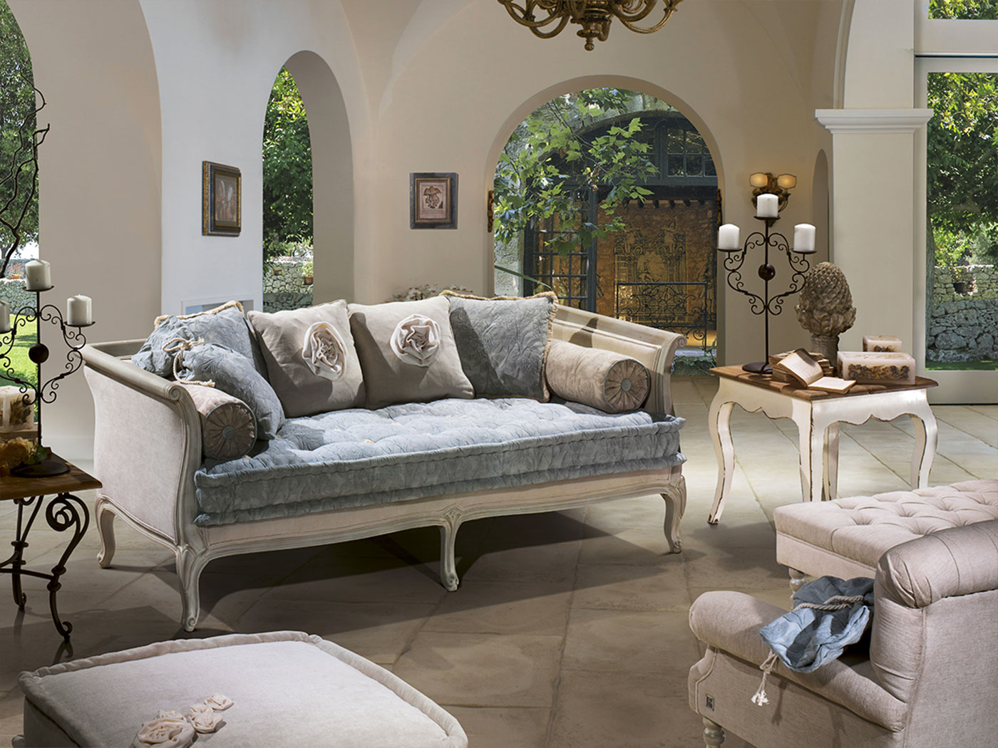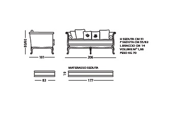 Набивка: пенополиуретан с различными размерами и качеством, полиэфирные волокна. Особенности: Отделка деревянного каркаса доступна в цветах каталога, подушка матрацное сиденье, стандартные подушки.