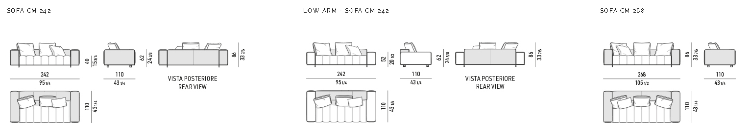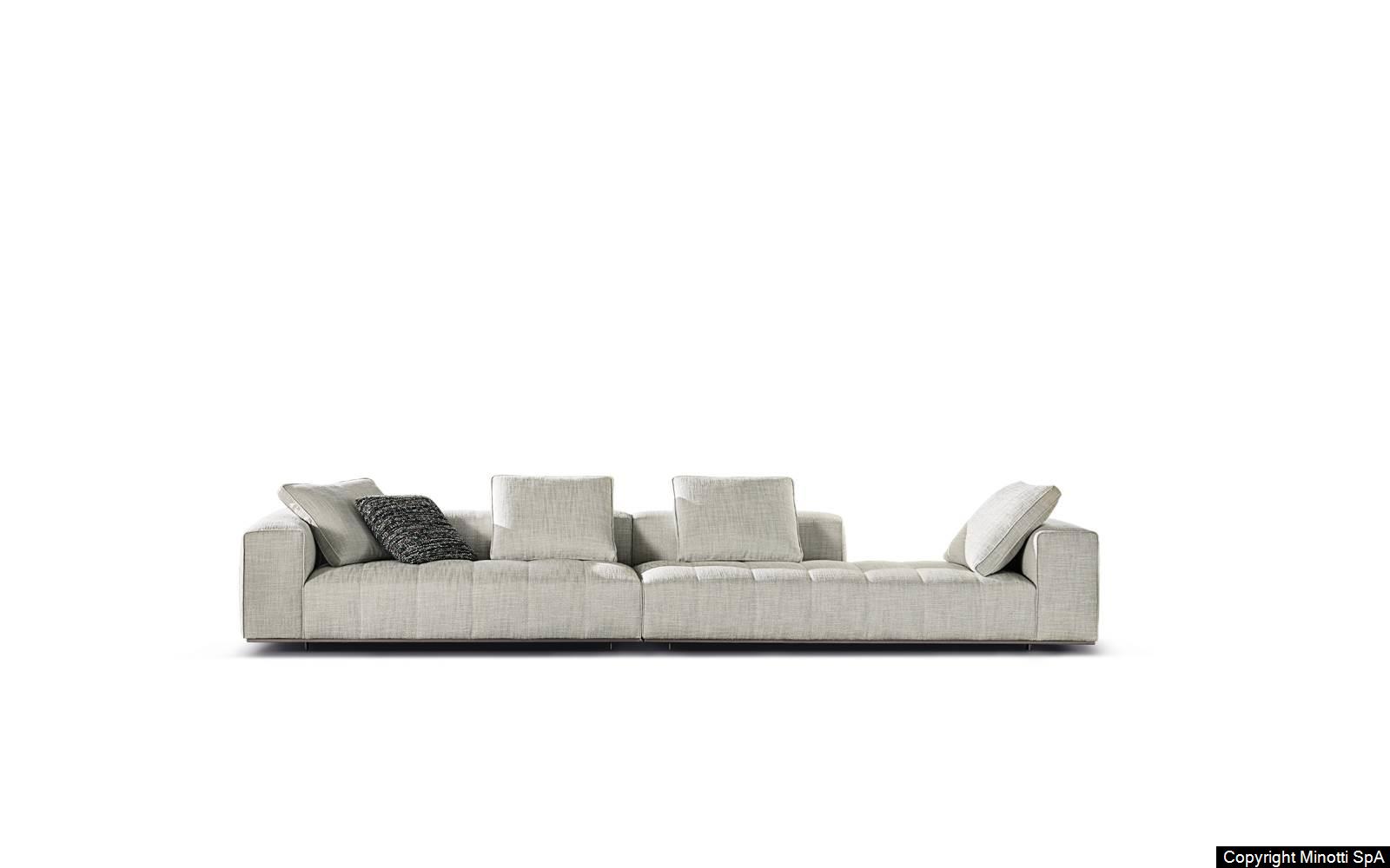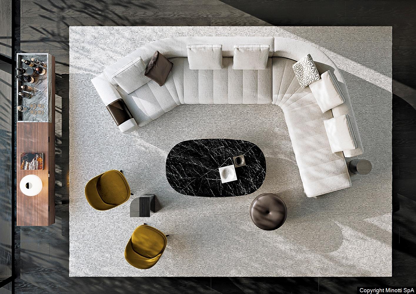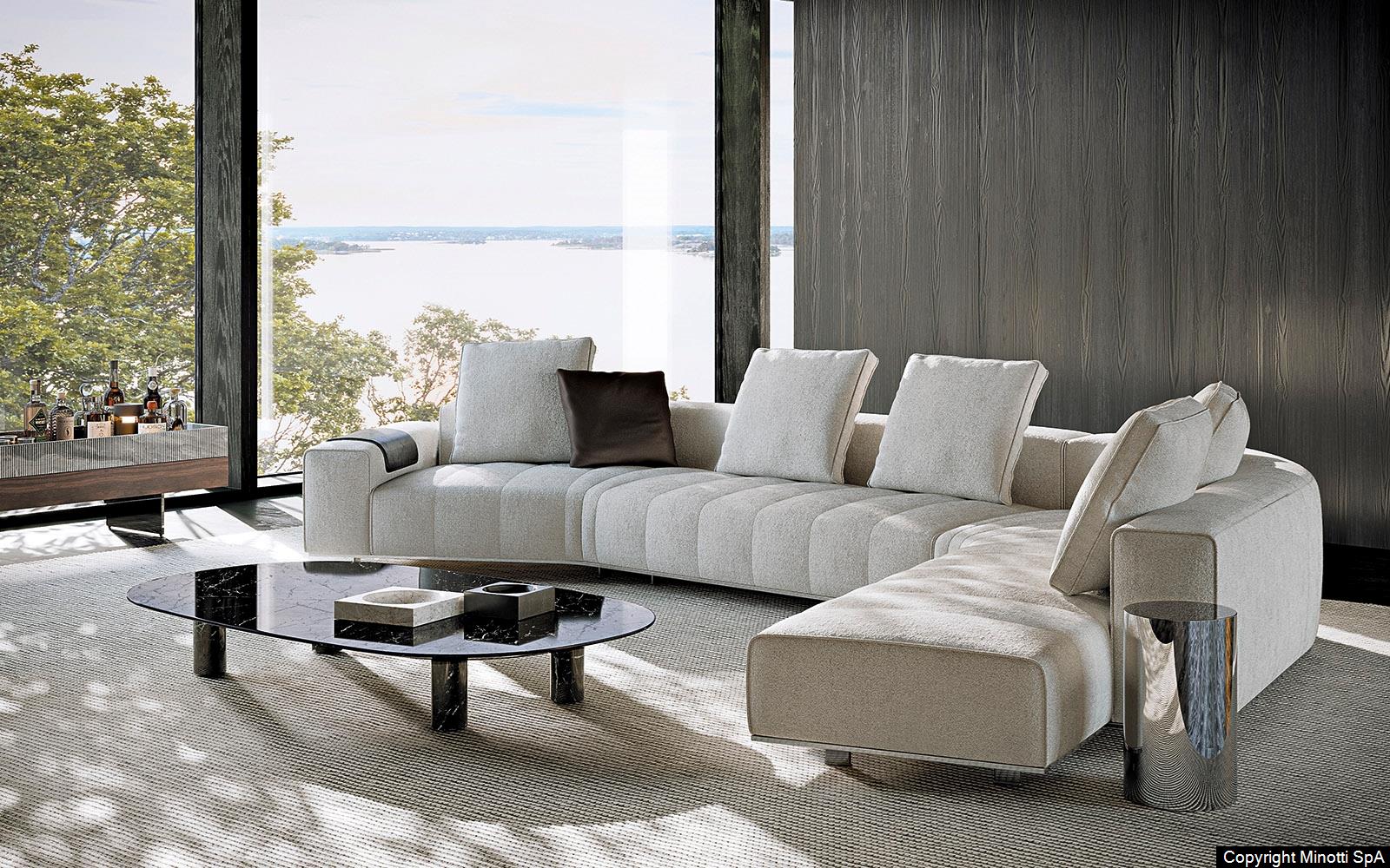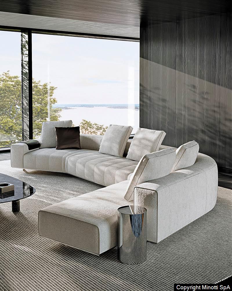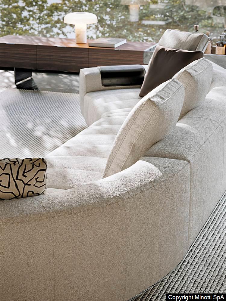 Швы мателассе, характерные для технологий Minotti, создают игру света и тени, имитируя стеганую обивку. Доступны линейные и динамичные конфигурации с изогнутыми элементами и углами 30°, 75° и 90°.