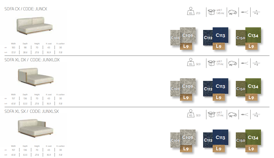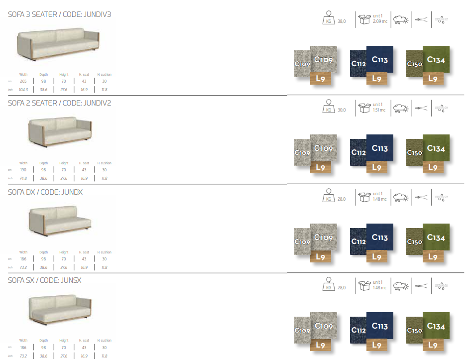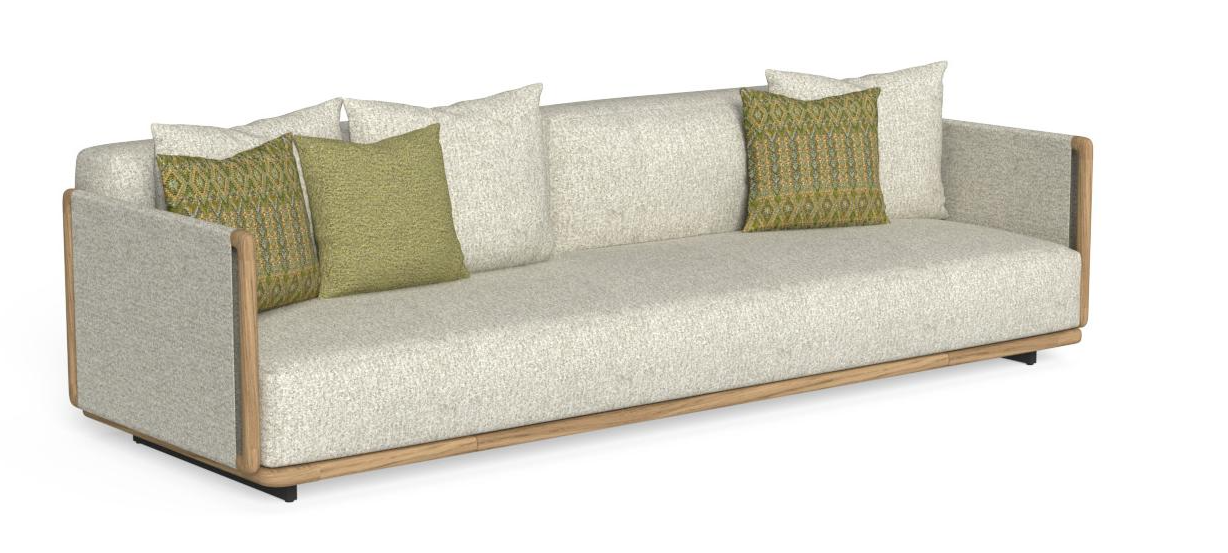 Трехместный диван Jun отличается просторными и компактными сиденьями, поддерживаемыми конструкцией из тикового дерева, которая подчеркивает его природную элегантность. Мягкие спинки и подлокотники, обтянутые тканью букле тон в тон, которую можно полностью снять, придают дивану гармоничную и изысканную эстетику. Ножки приподнимают конструкцию, создавая ощущение легкости, что делает 3-местный диван Jun идеальным выбором для современного и изысканного пространства на открытом воздухе.