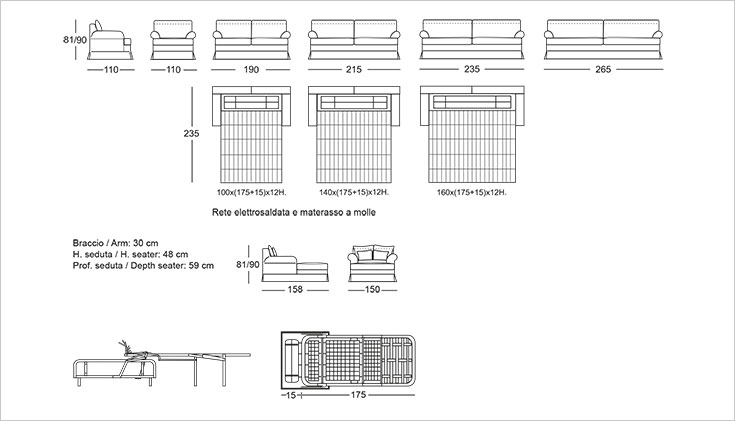 Варианты: кресло, 2-местный диван, 2 с половиной места, 3-местный, 3 с половиной места и шезлонг longue.Il 2-местный диван, 2 с половиной места и 3-местный доступен в версии кровати с электросварной сеткой и пружинным матрасом h. 12 cm.
