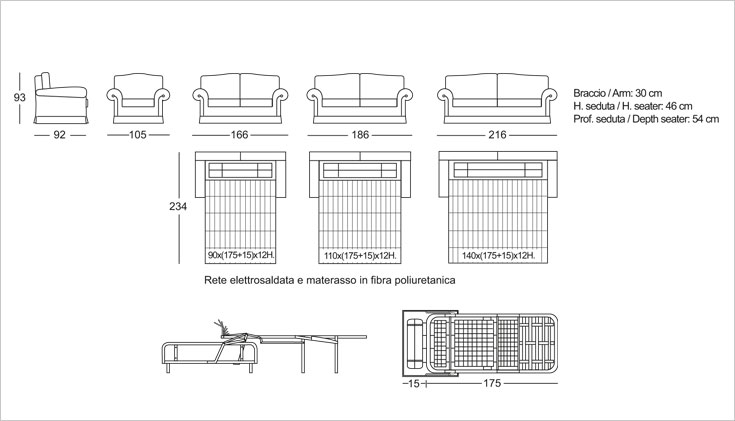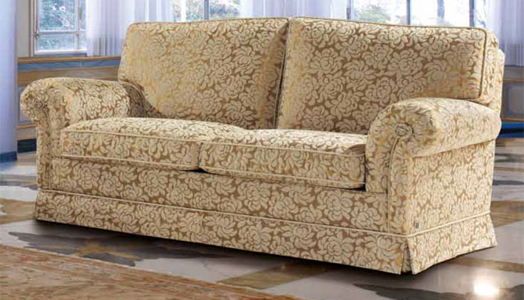Варианты: кресло, диван 2 места, 2 с половиной места и 3 места. 2-местный, 2-местный и 3-местный диван доступен в версии кровати с электросварной сеткой и матрасом из полиуретанового волокна h. 12 cm. Структура: дерево и его производные, высокопрочные перекрестные эластичные ремни. Набивка: пенополиуретан с различными размерами и качеством, полиэфирные волокна. Особенности: обшивка шнура и Волан. По запросу и за дополнительную плату доступен с бахромой или воланами и кольцевым краем.