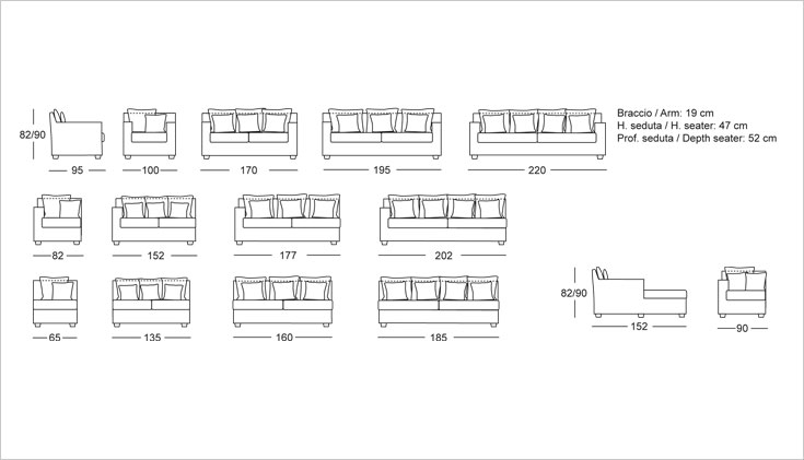 Версии: кресло, 2-местный диван, 2-местный диван, 3-местный диван и секционные версии с прямым/круглым углом или с терминалами и пуфиками. 2-местный, 2-местный и 3-местный диван доступен в версии кровати с электросварной сеткой и пружинным матрасом h. 12 cm.