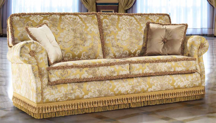 Варианты: кресло, диван 2 места, 2 с половиной места и 3 места. Структура: дерево и его производные, высокопрочные перекрестные эластичные ремни. Набивка: пенополиуретан с различными размерами и качеством, полиэфирные волокна. По запросу обивка из гусиного пуха. Особенности: шнур из фризской отделки и оборки в стандартной комплектации. Бахрома мадера с бантиком по запросу за дополнительную плату.