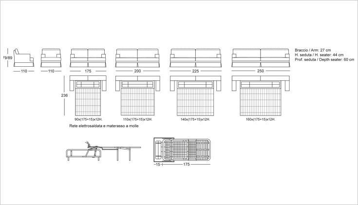 Версии: кресло, диван 2 места, 2 с половиной места, 3 места и 3 с половиной места. 2-местный, 2-местный , 3-местный и 3-местный диван доступен в версии кровати с электросварной сеткой и пружинным матрасом h. 12 cm. Структура: дерево и его производные, высокопрочные перекрестные эластичные ремни. Опора сиденья может поставляться с винтовыми пружинами за дополнительную плату. Набивка: пенополиуретан с различными размерами и качеством, полиэфирные волокна. По запросу обивка из гусиного пуха Особенности: полностью съемный. Доступно с оборками или открытыми ногами.
