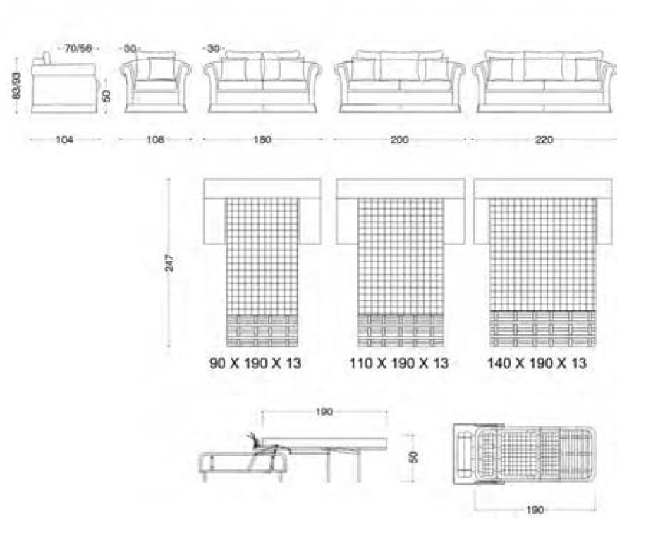Варианты: кресло, диван 2 места, 2 с половиной места, 3 места. 2-местный, 2-местный и 3-местный диван доступен в версии кровати с электросварной сеткой и матрасом из полиуретанового волокна h 13cm. Структура: дерево и его производные, высокопрочные перекрестные эластичные ремни. В версиях без кровати опора сиденья может поставляться с винтовыми пружинами за дополнительную плату. Набивка: пенополиуретан с различными размерами и качеством, полиэфирные волокна. По запросу вы можете настроить прокладку с любыми дополнительными расходами. Особенности: профили с обшивкой шнура в стандартной комплектации; подушечки из гусиного пуха, отделанные зубной щеткой в стандартной комплектации; доступны с воланом, с открытыми ногами или с бахромой (дополнительная стоимость).