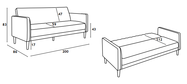 Деревянная конструкция, покрытая пеной высокой плотности со спиральными пружинами. Ножки из массива дерева. Внешняя ткань из 100% полиэстера, Размеры 200x86x83 см