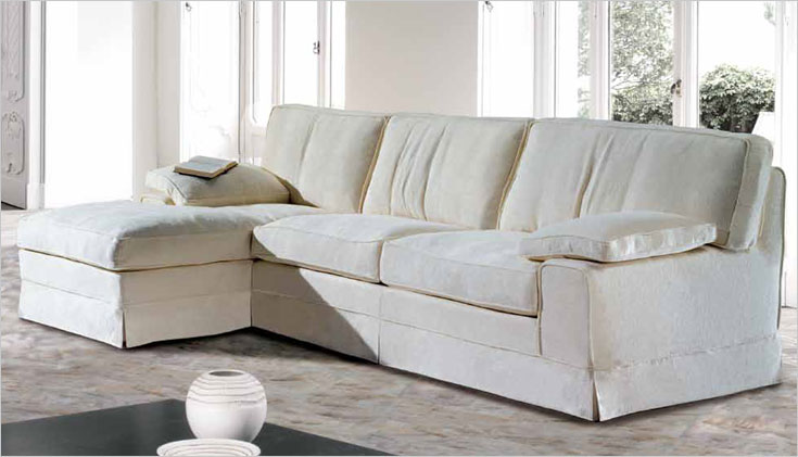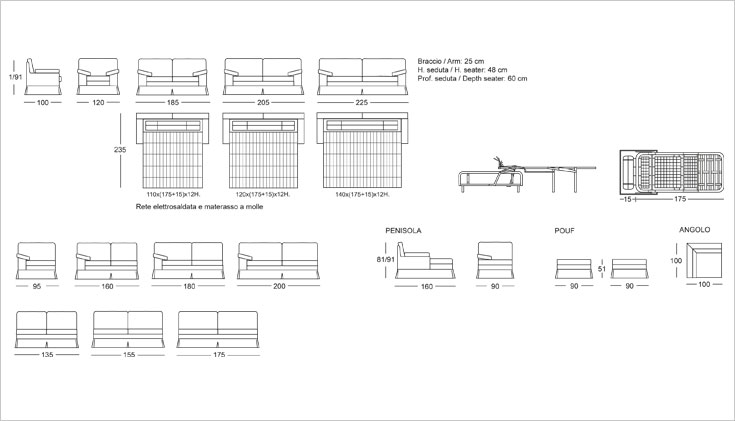 Версии: кресло, 2-местный диван, 2-местный диван, 3-местный диван и секционные версии с квадратным углом или с полуостровом и пуфиком. 2-местный, 2-местный и 3-местный диван доступен в версии кровати с электросварной сеткой и пружинным матрасом h. 12 cm. Структура: дерево и его производные, высокопрочные перекрестные эластичные ремни. Опора сиденья может поставляться с винтовыми пружинами за дополнительную плату. Набивка: пенополиуретан с различными размерами и качеством, полиэфирные волокна. По запросу обивка из гусиного пуха Особенности: полностью съемный в тканевой версии, не съемный в коже. Доступно с воланом или по запросу, с открытыми ногами.