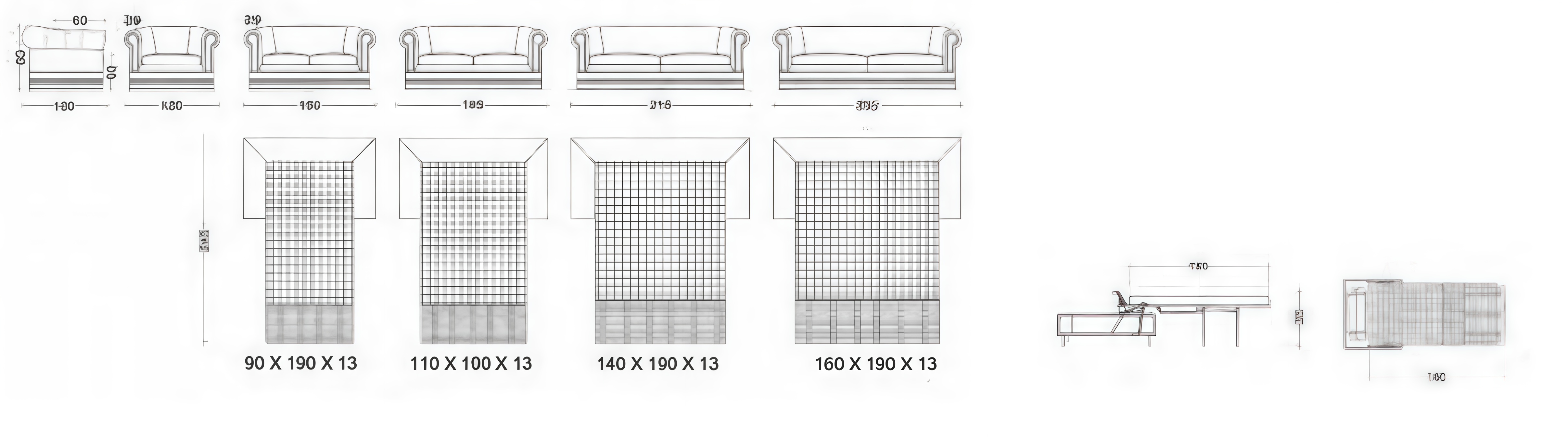Указаны варианты по посадочным местам: кресло, 2‑местный, 2,5‑местный, 3‑местный и 3,5‑местный. Матрас имеет высоту (толщину) 13 см.
