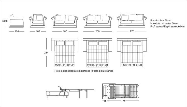 Варианты: кресло, диван 2 места, 2 с половиной места и 3 места. 2-местный, 2-местный и 3-местный диван доступен в версии кровати с электросварной сеткой и матрасом из полиуретанового волокна h. 12 cm.