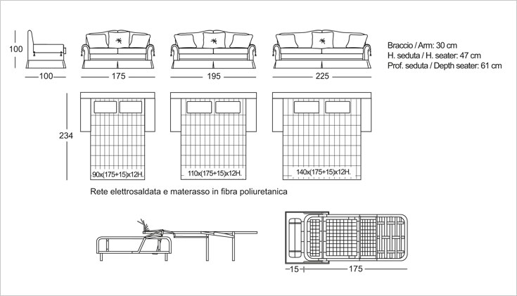 Подшипники спинки: 40MC5100 / 5105 CAT. И БУЛАВА КЛАССА 10 Версии: 2-местный диван, 2 с половиной места и 3-местный. 2-местный, 2-местный и 3 местный диван доступен в версии кровати с электросварной сеткой и матрасом из полиуретанового волокна h. 12 cm. Структура: дерево и его производные, высокопрочные перекрестные эластичные ремни. Набивка: пенополиуретан с различными размерами и качеством, полиэфирные волокна. Особенности: стандартные подлокотники и крышки.