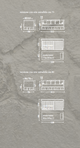 Версии: готовая кровать с деревянной решеткой и второй выдвижная кровать с механизмом открывания. диван в комплекте с 2 матрасами из пенопласта 13 см. Структура: древесина и ее производные. Обивка: полиуретан расширен до дифференцированных размеров и качества, волокна полиэстер, подушка из гусиного пуха. Характеристики: полностью съемный; ролики, подшипники и одеяло серия. Доступен в версии с сеткой 73 см и с сеткой 80 см.