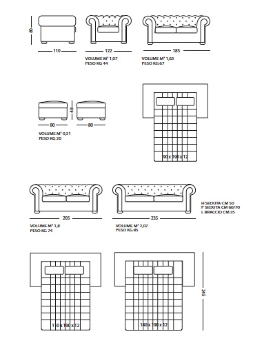 Варианты: кресло, 2-местный диван , 2 с половиной места, 3-местный и пуфик. 2-местный диван, 2 с половиной места, 3-местный доступен в версии кровати с электросварной сеткой и матрасом из полиуретанового волокна h. 12 cm. Структура: дерево и его производные, высокопрочные перекрестные эластичные ремни. Опора сиденья может поставляться с винтовыми пружинами за дополнительную плату. Набивка: пенополиуретан с различными размерами и качеством, полиэфирные волокна. По запросу обивка сиденья из гусиного пуха. Особенности: стандартные пули, открытые ноги .