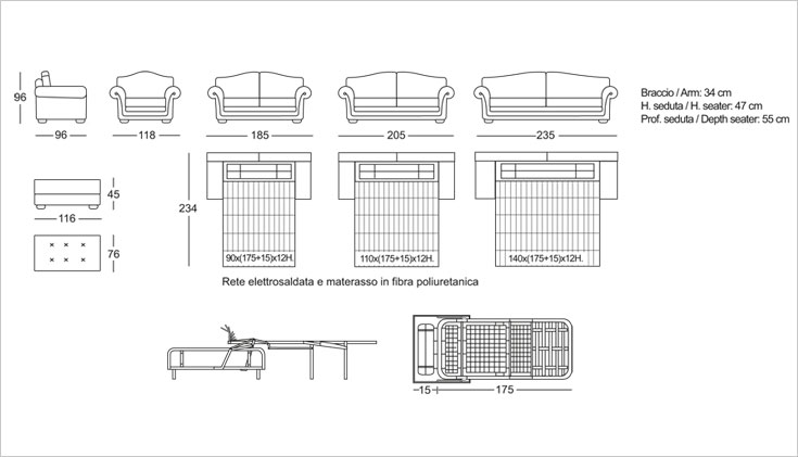 Варианты: кресло, диван 2 места, 2 с половиной места, 3 места и пуф capitonnè. 2-местный, 2-местный и 3-местный диван доступен в версии кровати с электросварной сеткой и матрасом из полиуретанового волокна h. 12 cm. Структура: дерево и его производные, высокопрочные перекрестные эластичные ремни. Набивка: пенополиуретан с различными размерами и качеством, полиэфирные волокна. По запросу обивка из гусиного пуха. Особенности: подушки сиденья с бордюром, наплечные подушки с зубной щеткой.