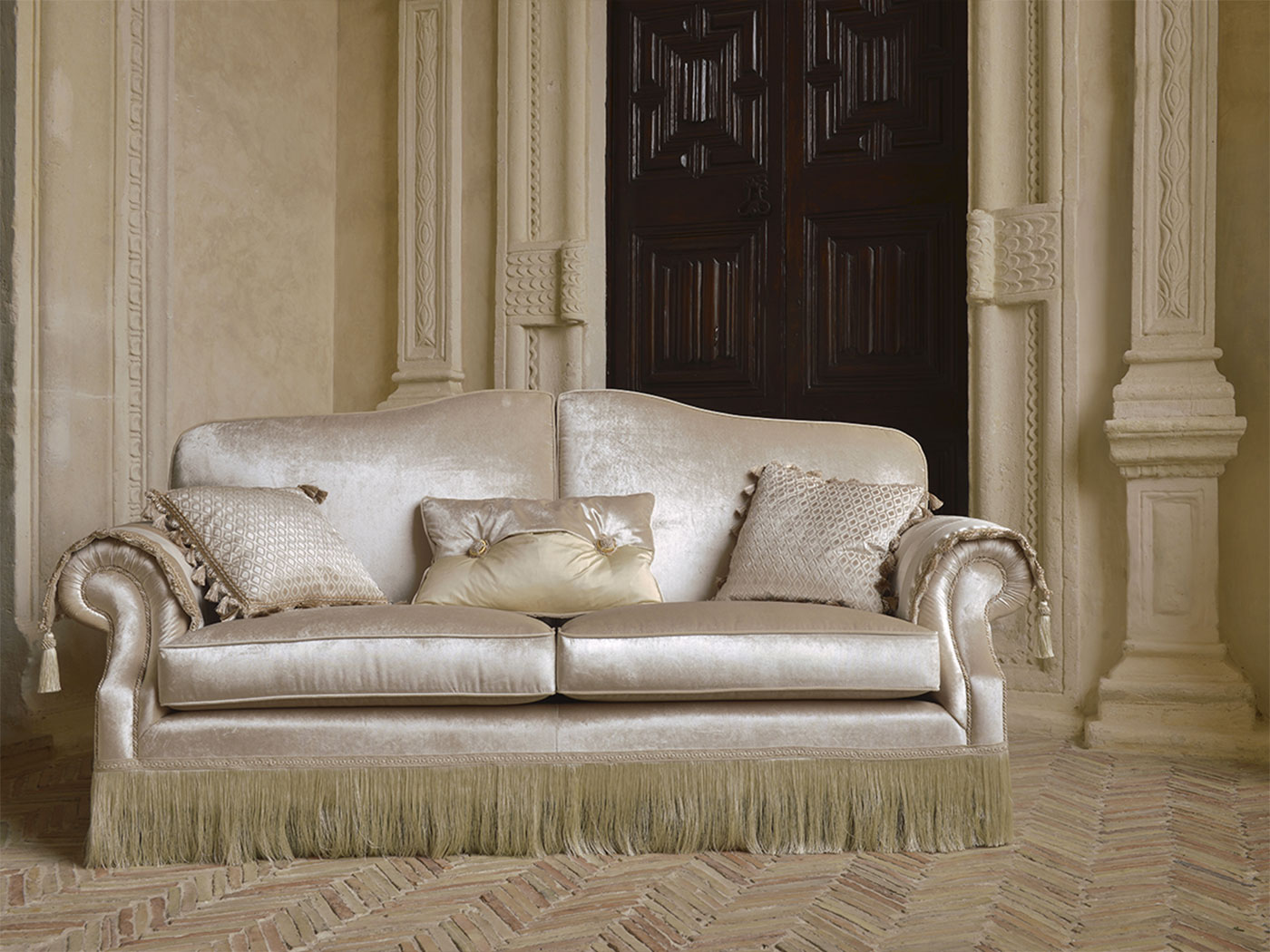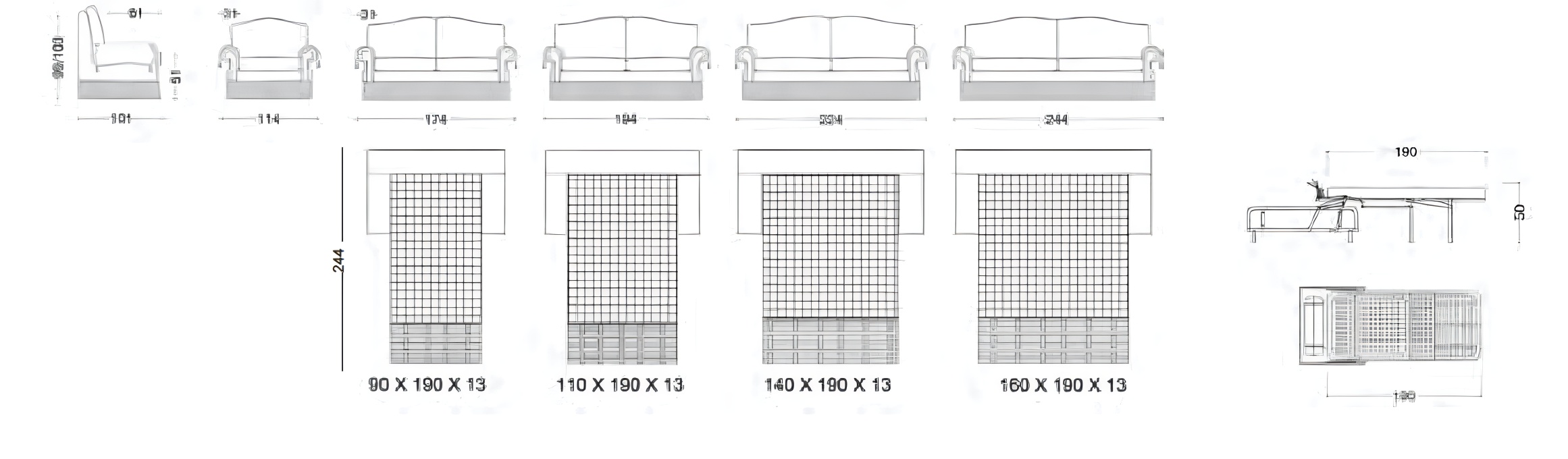 Версии: кресло, диван 2 места, 2 с половиной места, 3 места и 3 полтора места. Диван 2 места, 2 с половиной места, 3 места и 3 места и половина доступна в версии кровати с электросварной сеткой и матрас из полиуретанового волокна h 13cm. Структура: дерево и его производные, высокопрочные перекрестные эластичные ремни. В версии без кровати, поддержка сиденья может быть предоставлена с винтовыми пружинами с дополнительной стоимостью. Обивка: в