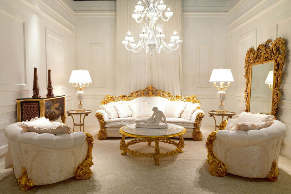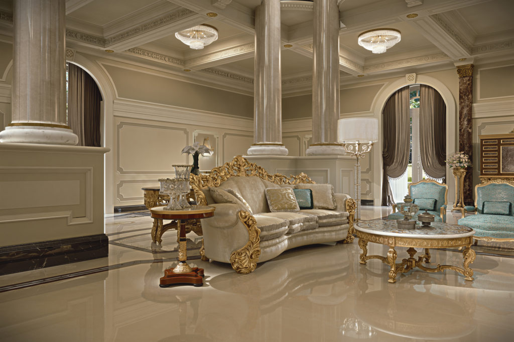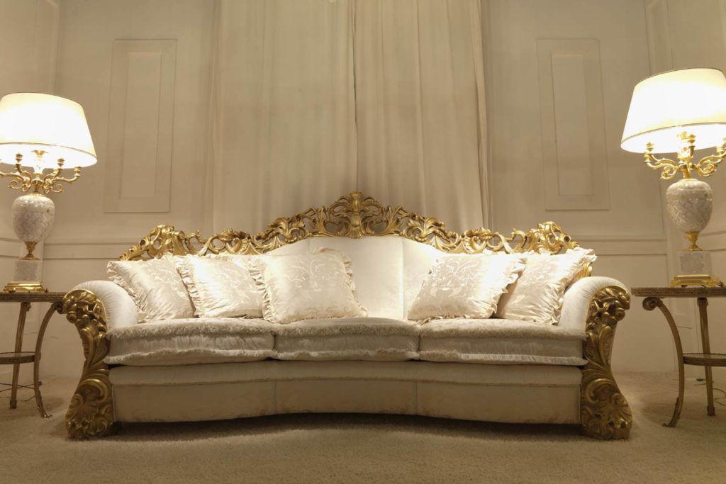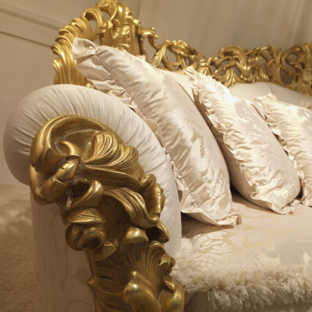 Гостиная LEONARDO: кресло и диван — это предложение ZANABONI в стиле барокко. Отличительными элементами этого стиля являются форма и декор, вырезанные из дерева, украшенные отделкой из сусального золота, толщина которой была придана патиной цвета слоновой кости. Его стиль представляет собой видение: искусство жизни через мебель и аксессуары, в которых дизайн, стиль, материя, новые работы и пошив создают новые эстетические коды.