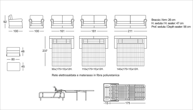 Версии: кресло, диван 2 места, 2 с половиной места, 3 места, 3 с половиной места и секционные версии с прямым углом или круглый угол. 2-местный, 2-местный, 3-местный и 3-местный диван доступен в версии кровати с сварная сетка и матрас из полиуретанового волокна h 13 см. Структура: дерево и его производные, эластичные ремни скрещенные с высокой прочностью. В версиях без кровати опора сиденья может поставляться с винтовыми пружинами с дополнительная плата. Набивка: пенополиуретан с различными размерами и качеством, полиэфирные волокна. По требованию, вы можете настроить отступы с относительными дополнительными затратами. Особенности: профили с окантовкой в стандартной комплектации; доступно с воланом, с открытыми ногами или с бахромой в качестве фото (дополнительная плата).