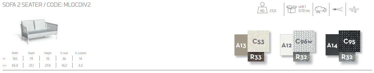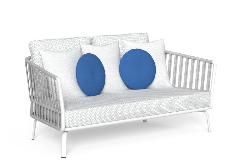 Марко Ачербис (Marco Acerbis), создавая 2-местный диван Milo, руководствовался вниманием к деталям и романтической элегантностью. Несмотря на то, что он без излишеств подходит для открытых пространств, это предмет с сильной душой, с гибкими, но в то же время жесткими линиями. Каркас выполнен из алюминия с порошковым покрытием, обивка и подушки — из текстиля. Подушки, набитые быстросохнущим поролоном, снимаются, их легко стирать и они устойчивы к атмосферным воздействиям.
