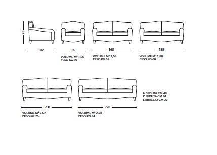 Версии: кресло, диван 2 места, 2 с половиной места, 3 места и 3 с половиной места. Структура: дерево и его производные, высокопрочные перекрестные эластичные ремни. Поддержка сиденье может поставляться с винтовыми пружинами за дополнительную плату. Набивка: пенополиуретан с различными размерами и качеством, полиэфирные волокна. По требованию, обивка из гусиного пуха. Особенности: полностью съемные, открытые ноги.