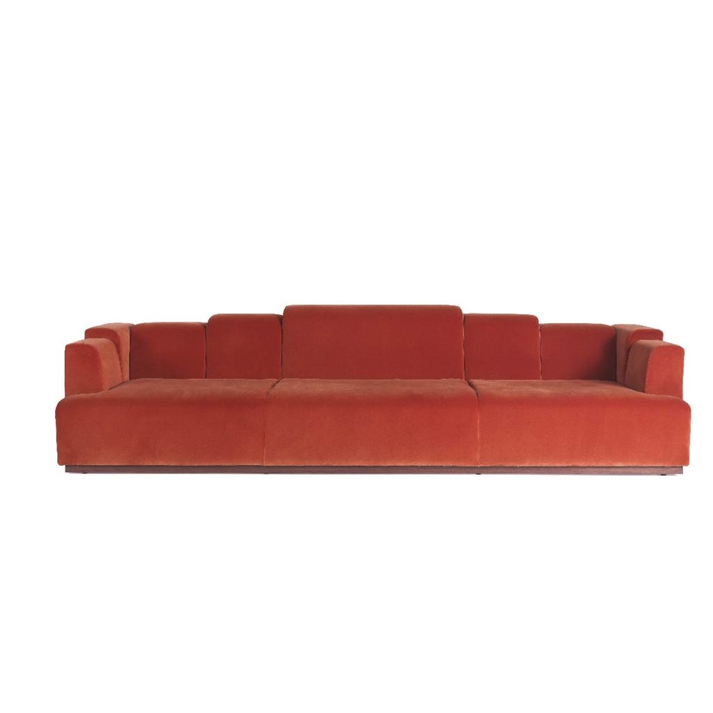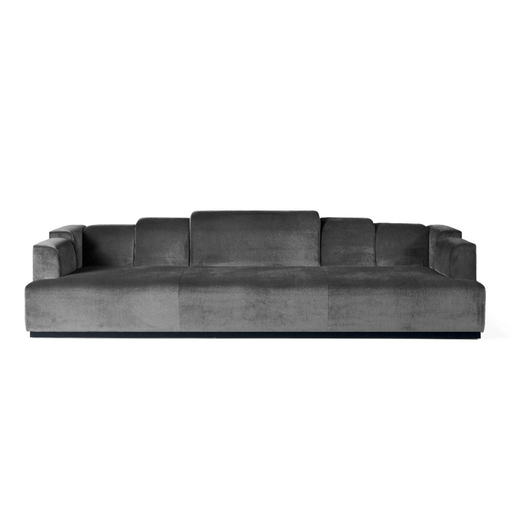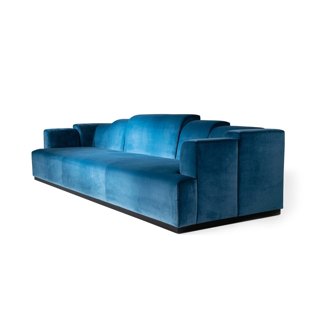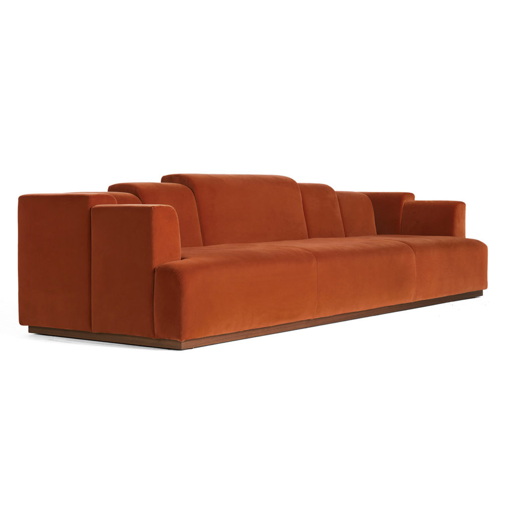 Диван в современном стиле с подставкой из дерева, окрашенного в орех canaletto Moderna. Спинка, отмеченная градуированной высотой, идентифицирует символическую икону коллекции Moderna della Furnitura ZANABONI EDIZIONI. NOUVELLE VAGUE доступен в 4-местный, 3-местный, 2-местный и кресло версии.