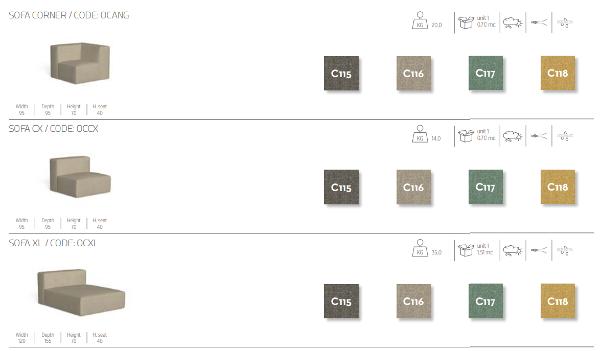 Благодаря своим массивным и скульптурным формам модульный диван Ocean дает возможность оформить пространство на открытом воздухе в соответствии с вашими потребностями. Подушки, набитые быстросохнущей пеной, имеют съемные чехлы, их легко стирать и они устойчивы к атмосферным воздействиям. Яркие ткани удачно сочетаются с внушительными объемами подушек, что делает этот диван неподвластным времени предметом мебели, сочетающим функциональность с изысканным дизайном. Богатая цветовая палитра хорошо сочетается с модульностью отдельных элементов, создавая игру нюансов и оттенков, которые делают это изделие визитной карточкой вашей уличной мебели.