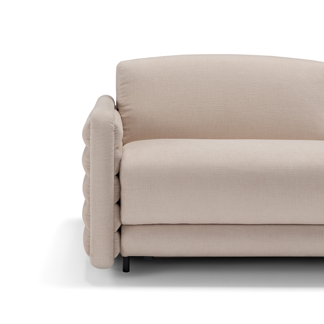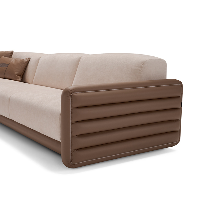 Силуэт дивана Penelope сочетает мягкие линии с архитектурной выразительностью. Горизонтальные полосы на подлокотниках создают эффект движения, а лаконичные формы делают его универсальным для интерьеров любого стиля — от неоклассики до contemporary. Диван предназначен для размещения в центре комнаты, становясь главным акцентом, который притягивает взгляды и задает тон всему пространству.
