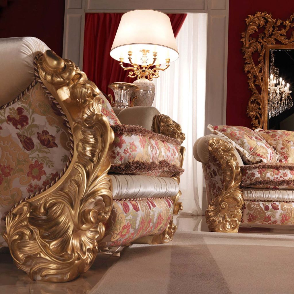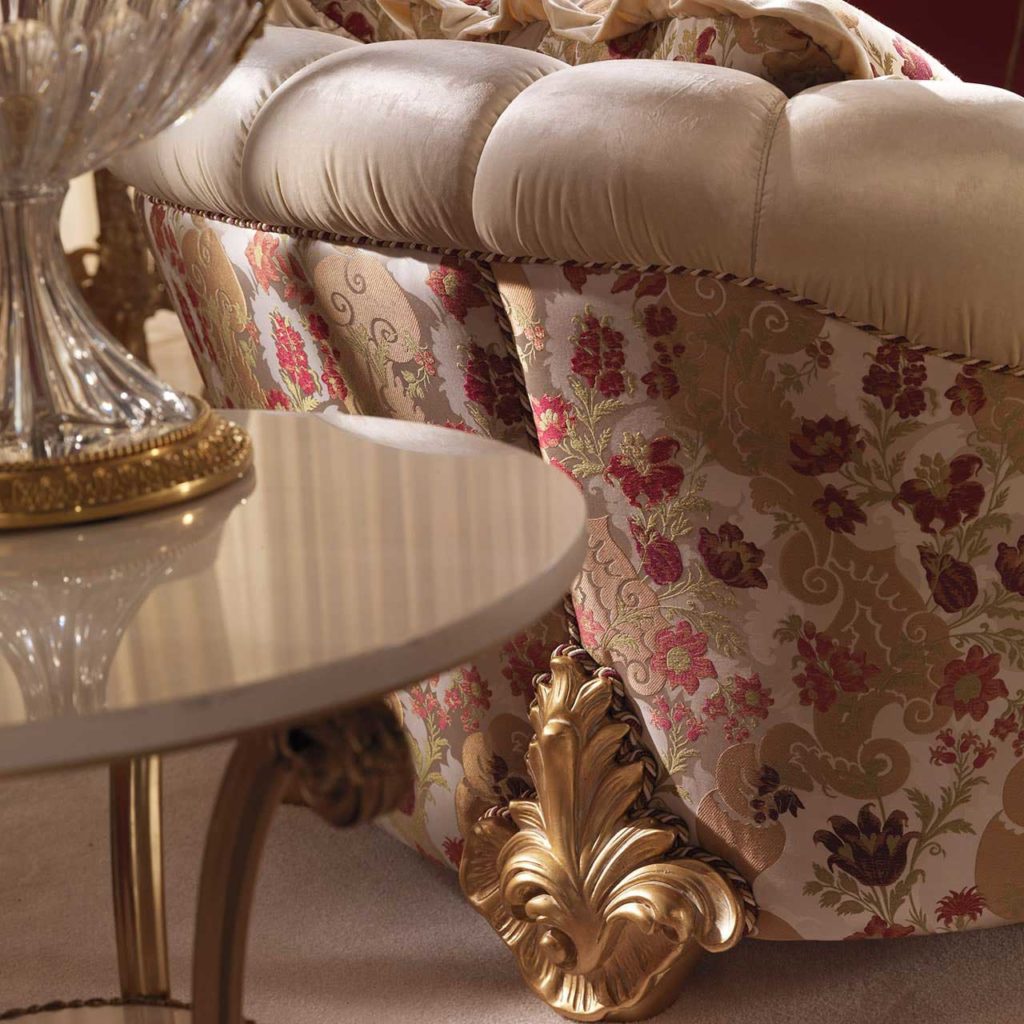 Элегантный мягкий диван с дамасской обивкой. Диван RENOIR украшен замечательной резьбой, отделанной золотом с патиной цвета слоновой кости, отделан изысканными материалами на основе старинных ремесленных приемов, передаваемых из поколения в поколение.