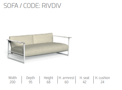 Яркие и элегантные линии 2-местного дивана из коллекции Riviera прекрасно подойдут для гостиной на открытом воздухе. Изысканная эстетика и изысканность материалов не умаляют функциональности изделия, гарантируемой алюминиевой конструкцией. Обивка из быстросохнущего пенопласта, обтянутая съемной и устойчивой к атмосферным воздействиям тканью, представлена в трех цветовых вариациях, умело сочетающихся с тонами конструкции и подлокотниками из керамогранита или Accoya.