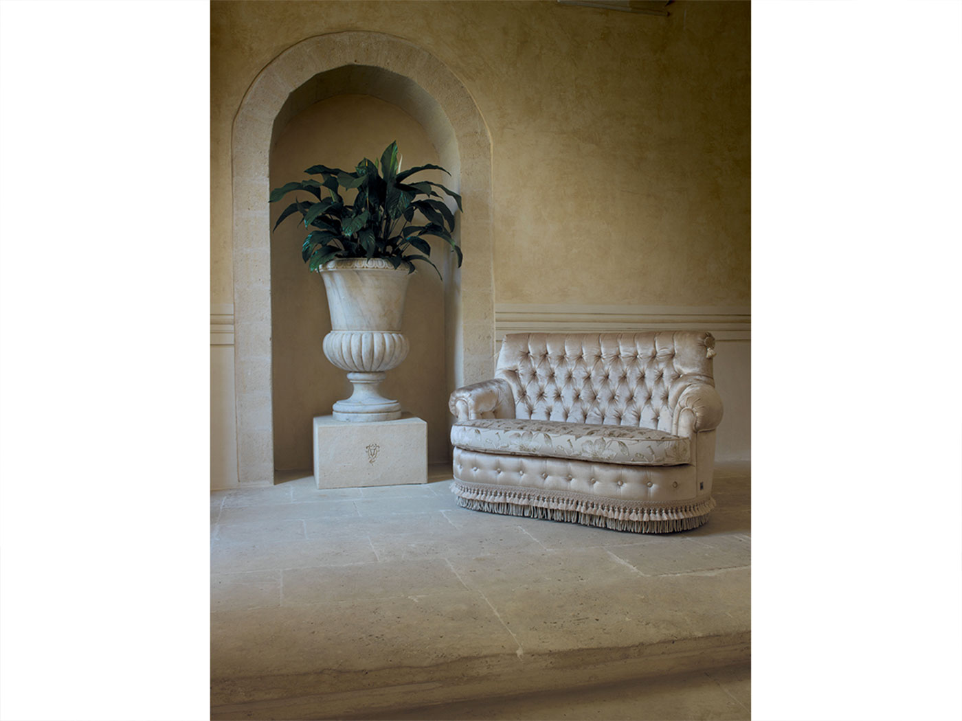 Версии: 2-местный диван. Структура: дерево и его производные, высокие перекрестные эластичные ремни сопротивление. По запросу поддержка сиденья может поставляется с винтовыми пружинами за дополнительную плату. Обивка: пенополиуретан по высоте и качеству дифференцированные, полиэфирные волокна. По запросу вы можете настройте прокладку с любыми дополнительными расходами. Особенности: доступно с бахромой как фото, или по запросу, с оборками плиссе.