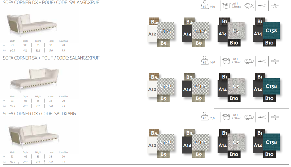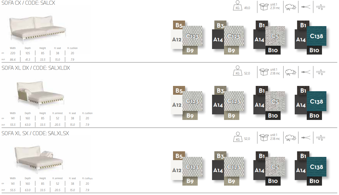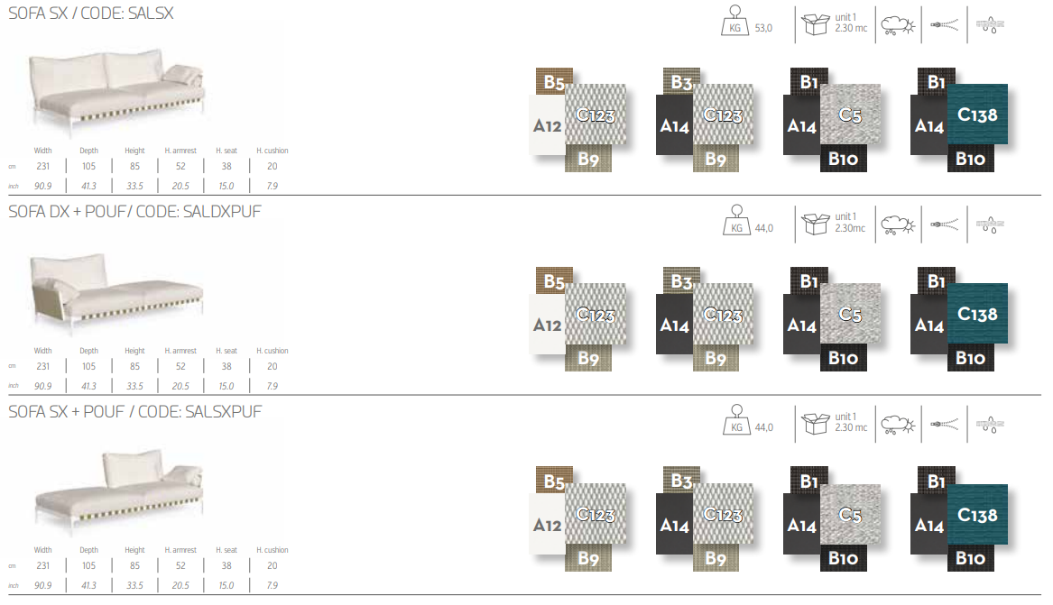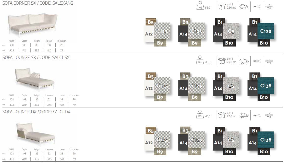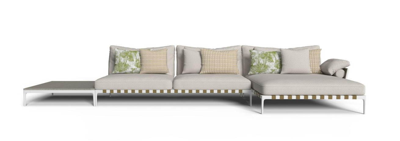 Модульный диван из коллекции Salinas придает шарм и изысканность интерьеру на открытом воздухе. Благодаря преобладающему текстильному компоненту он обеспечивает преемственность между внутренним и наружным пространством. Натуральные цвета различных элементов дивана составляют цветовую гамму, вдохновленную регионом Салинас, Ибица. Мягкий дизайн подушек в сочетании с металлическими деталями создает поразительную композицию, выражающую неподвластную времени элегантность.