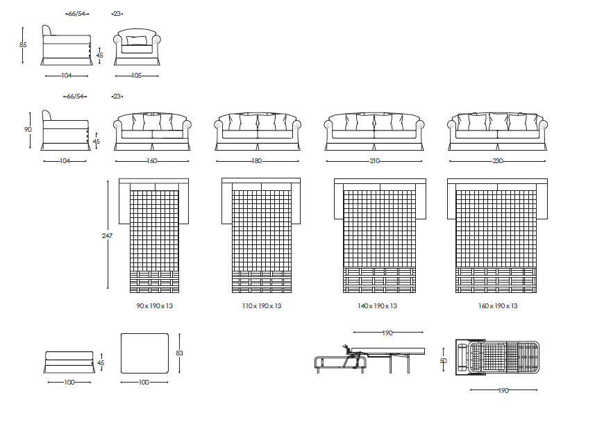 Версии: пуф, кресло, 2 места, 2 с половиной места, 3 места и три с половиной места . Диван 2 места , 2 места 3 с половиной места, 3 с половиной места доступны в версии кровать с электросварной сеткой и матрас из полиуретанового волокна h 13cm. Структура: дерево и его производные, перекрестные эластичные ремни высокоомный. Обивка: полиуретан расширен до дифференцированных размеров и качества, волокна полиэфир. По запросу вы можете настроить обивка с относительными дополнительными расходами. Особенности: стандартные пуховые подушки; с волчок;