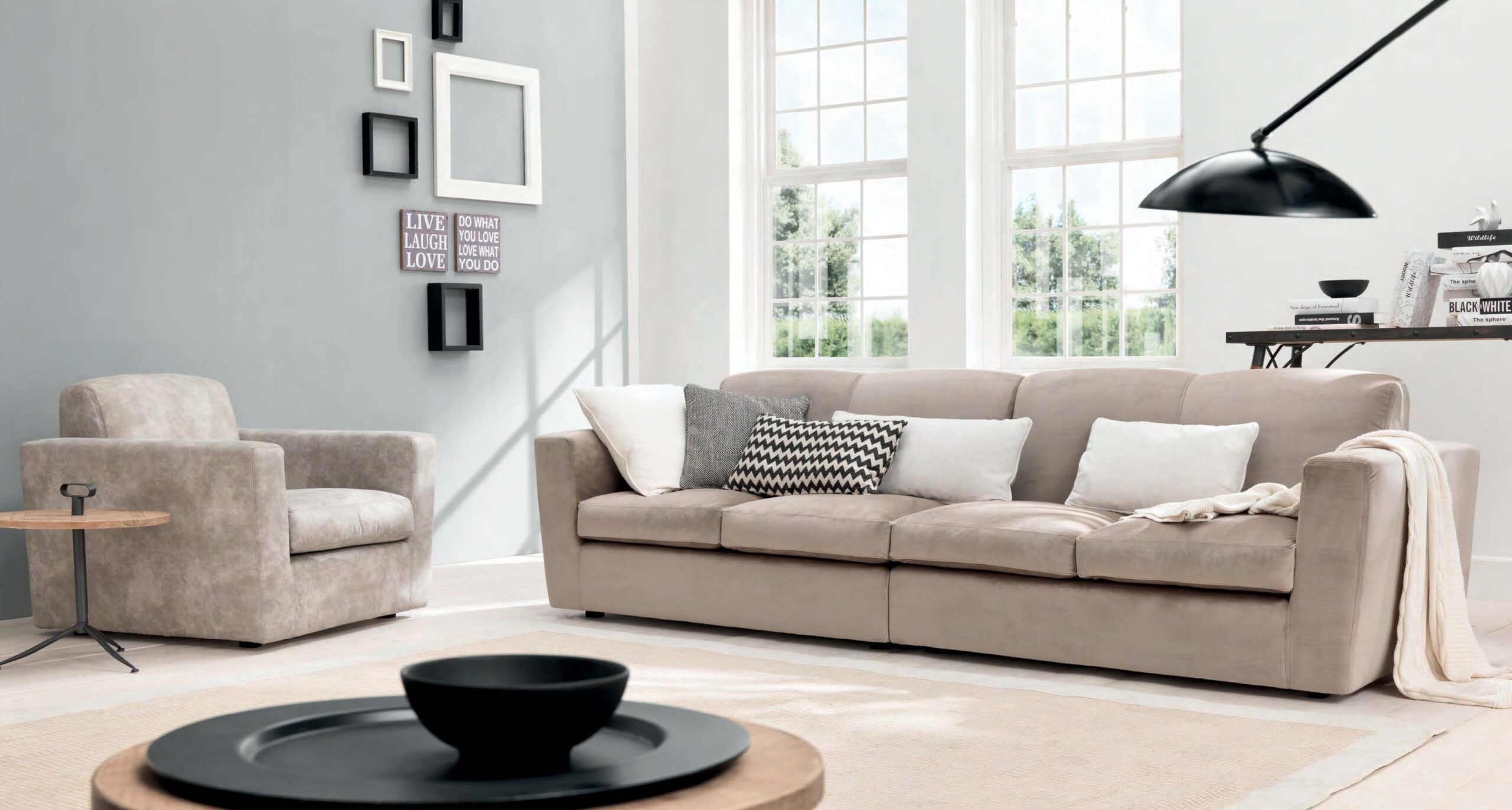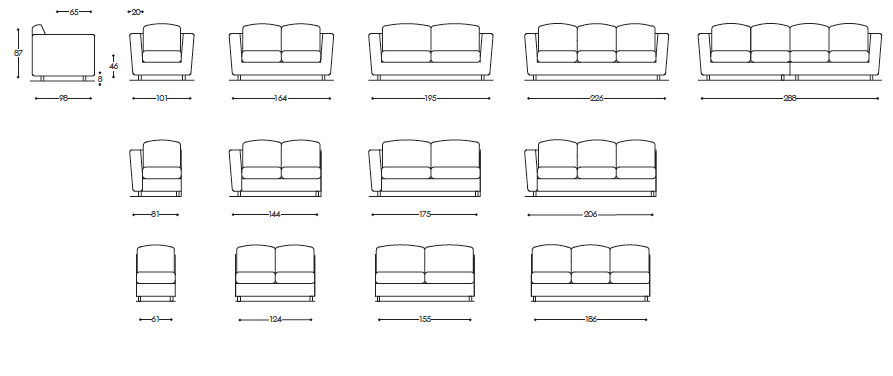 Версии: кресло, 2 места, 2 с половиной места, 3 места и модульные версии. Структура: дерево и его производные, эластичные ремни скрещенные с высокой прочностью. Обивка: пенополиуретан по высоте и качеству дифференцированные, полиэфирные волокна. По требованию, вы можете настроить отступы. Особенности: съемный; открытые ноги в отделке согласно каталогу.