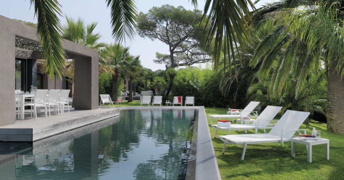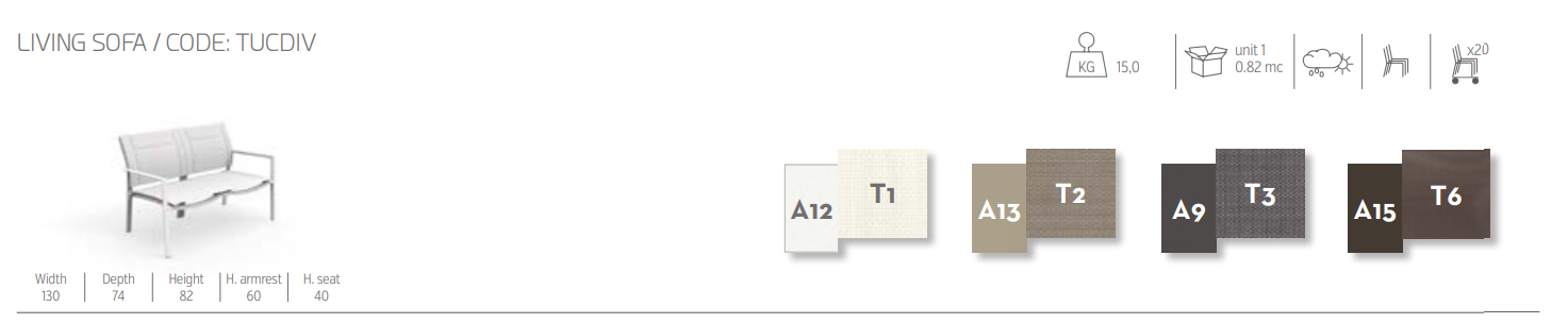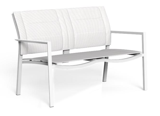 Два сиденья дивана для гостиной, изготовленные из текстиля и алюминия, просты, но не банальны. Сочетая квадратную геометрию конструкции с мягкими изгибами ткани, он сочетает в себе простоту коллекции Touch с завершенностью, которую изделие создает на открытом воздухе.