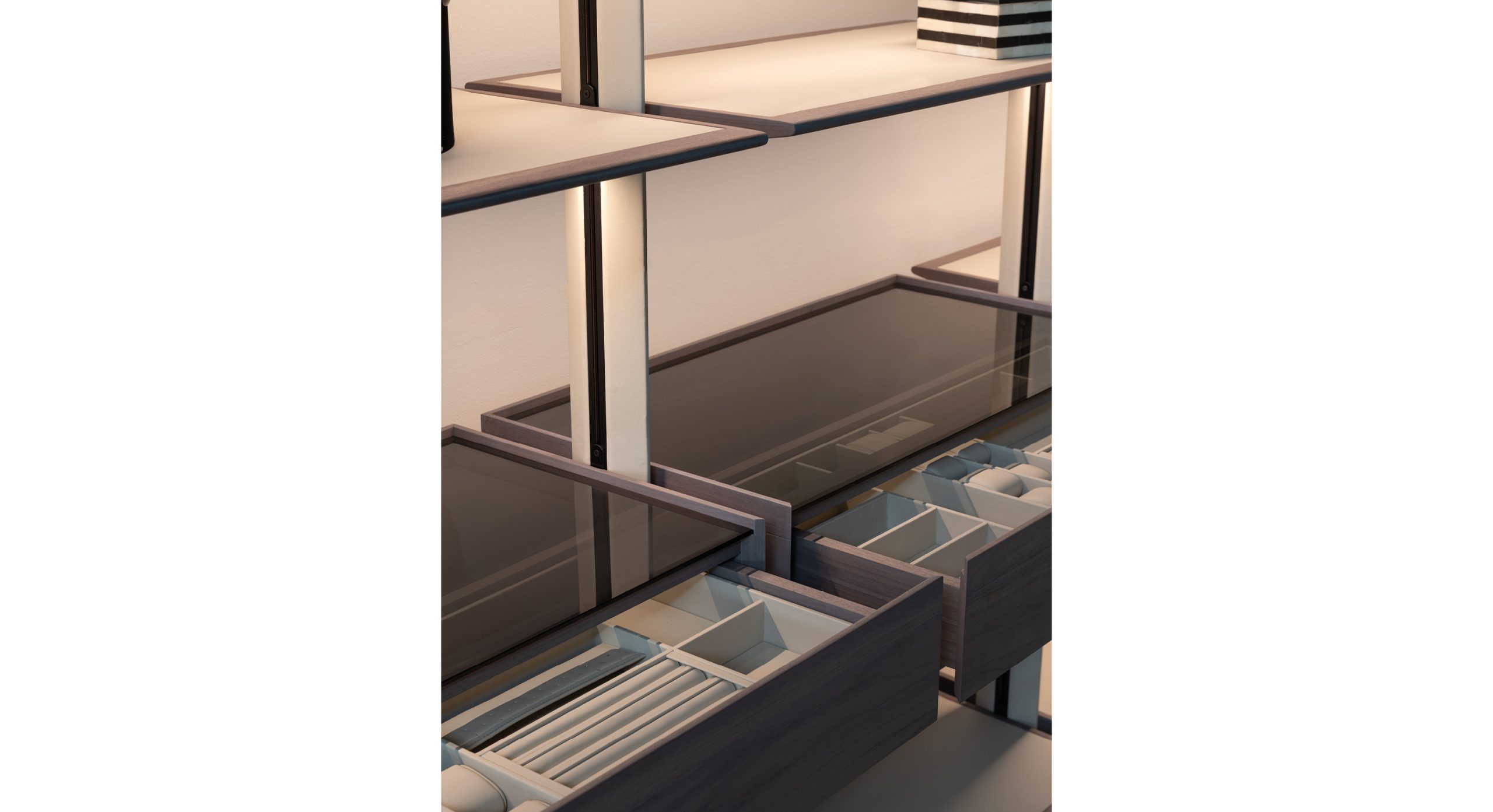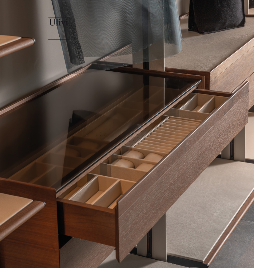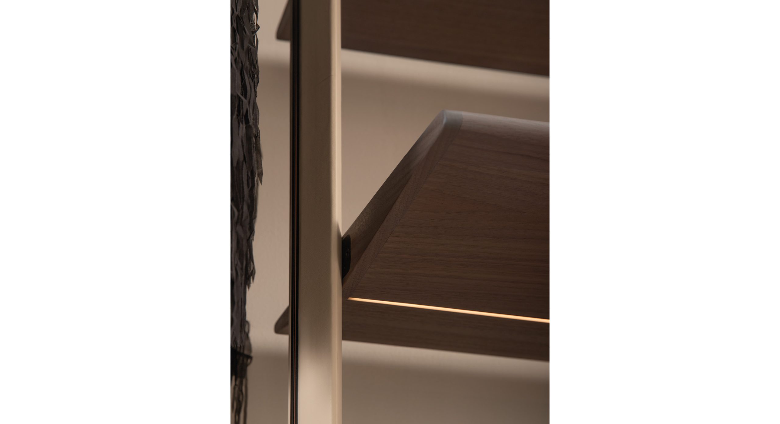 Модульная система Night от Ulivi Salotti воплощает в себе идеальный баланс современного дизайна и функциональности. Стойки шкафов этой коллекции отделаны эксклюзивной кожей, что придает им элегантности и утонченности. Полки изготовлены из массива грецкого ореха, а кожаные столешницы придают им нотку роскоши и уникальности. Встроенная светодиодная подсветка под полками улучшает эстетику и обеспечивает оптимальное удобство использования, создавая изысканную атмосферу. Модули доступны в трех вариантах ширины: 75 см, 90 см и 105 см, что позволяет удовлетворить любые требования к пространству и индивидуальному заказу.