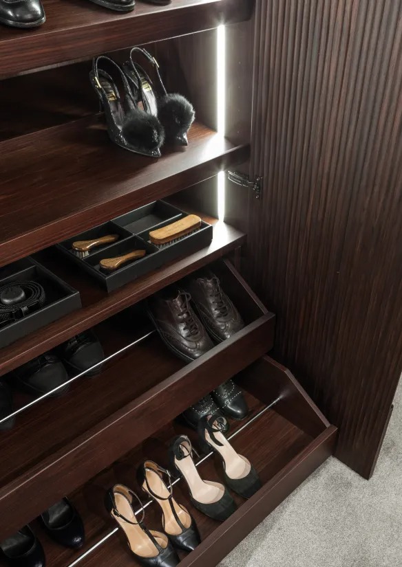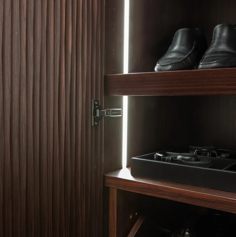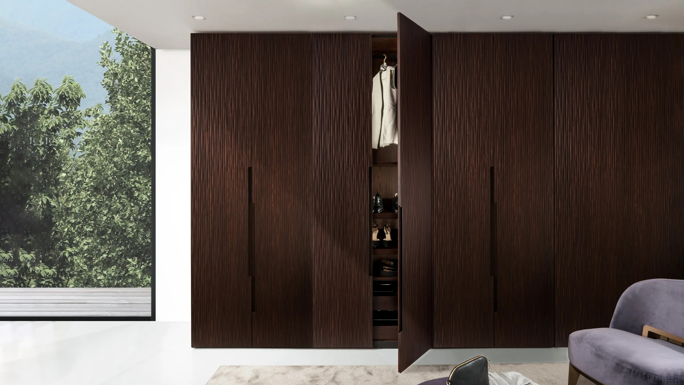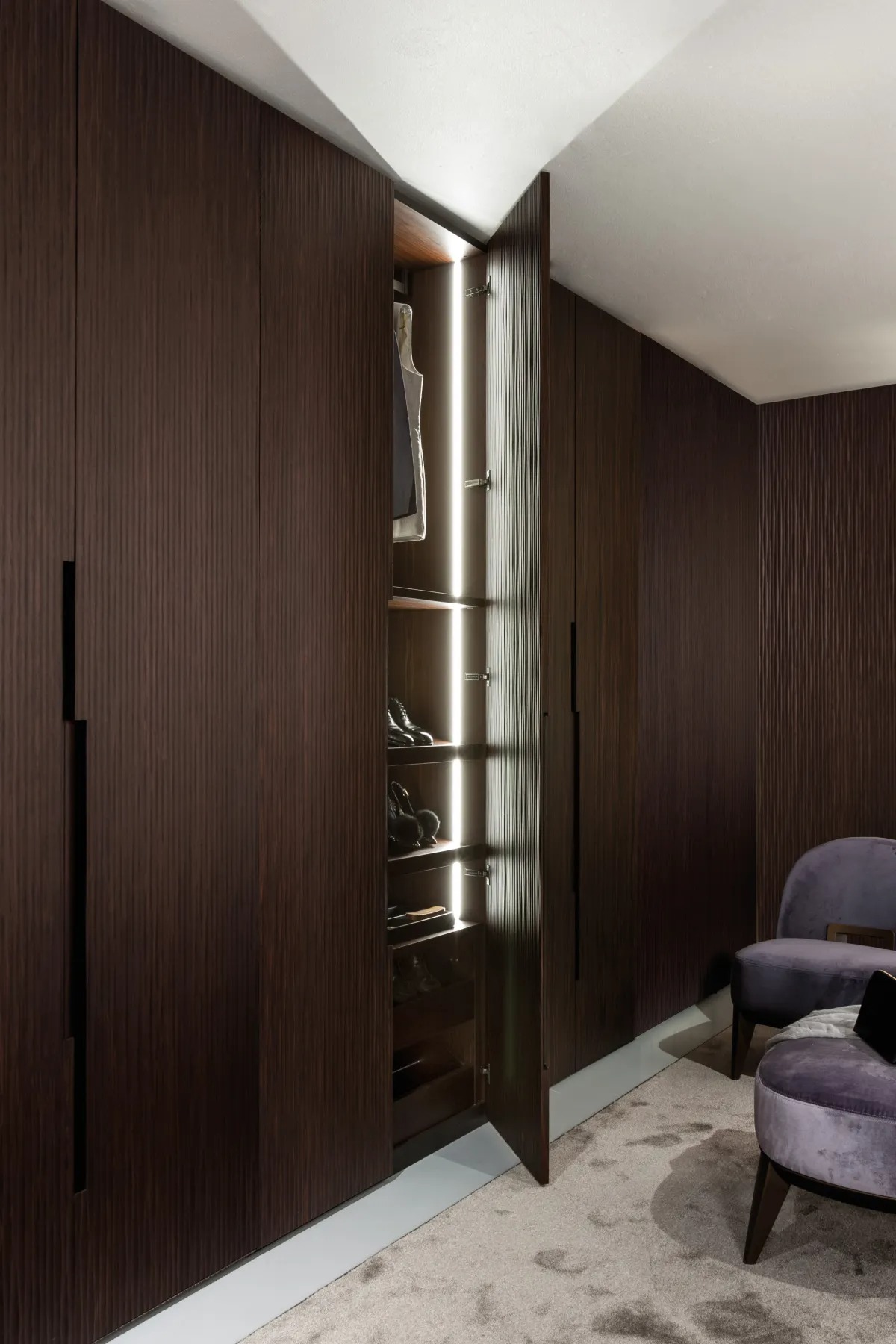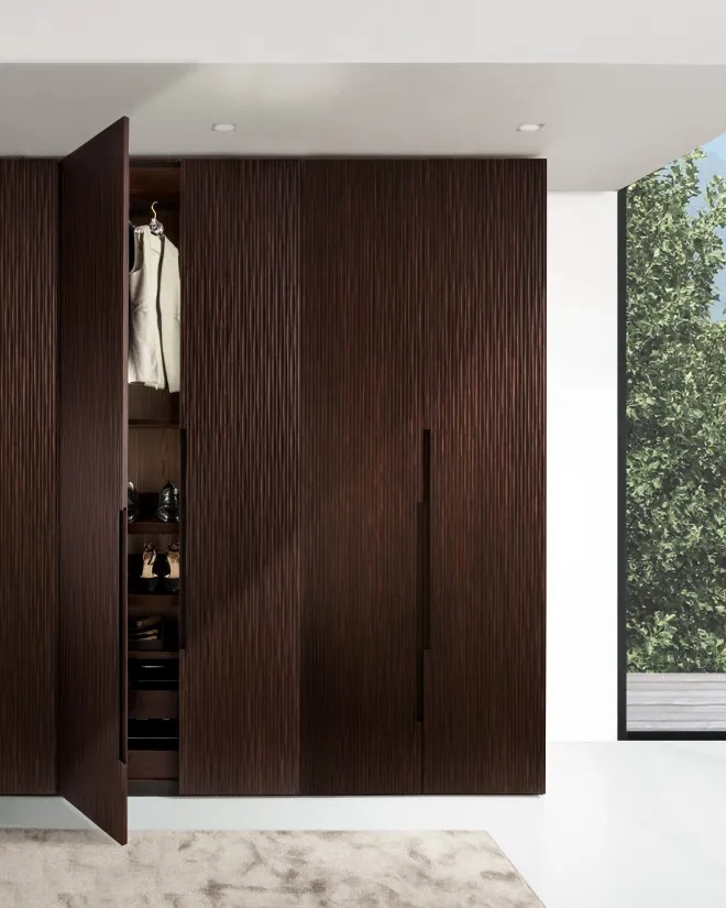Система гардеробов на заказ с резьбой Onda, персонализируемая по размеру и отделке. Доступна по индивидуальному проекту с персонализируемыми аксессуарами, оборудованием и внутренней отделкой, а также со встроенной светодиодной подсветкой.