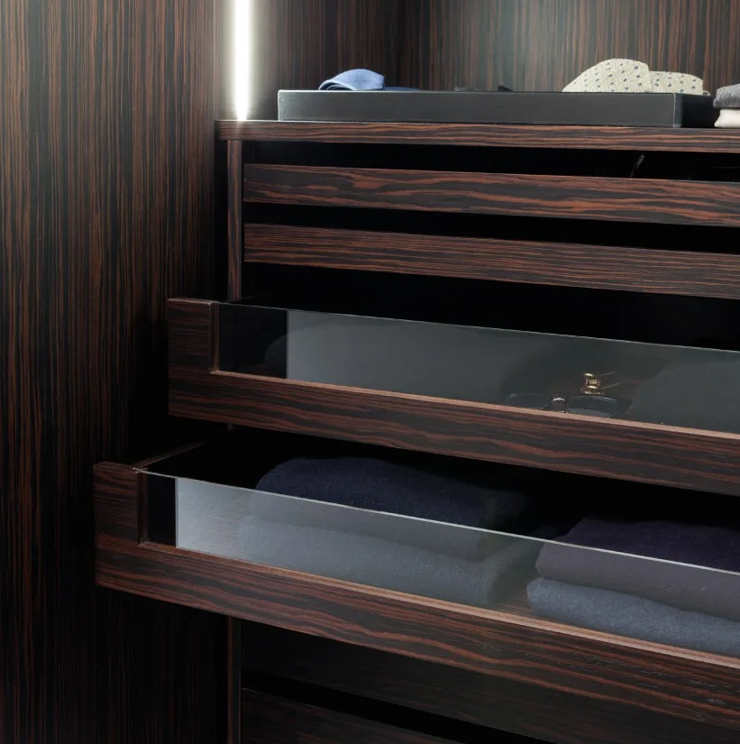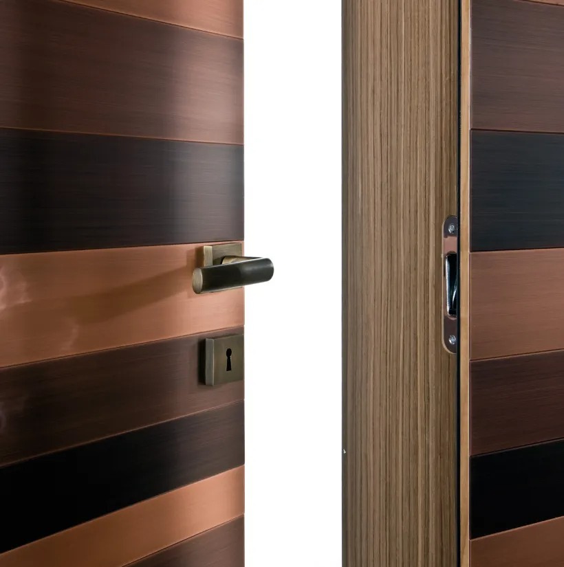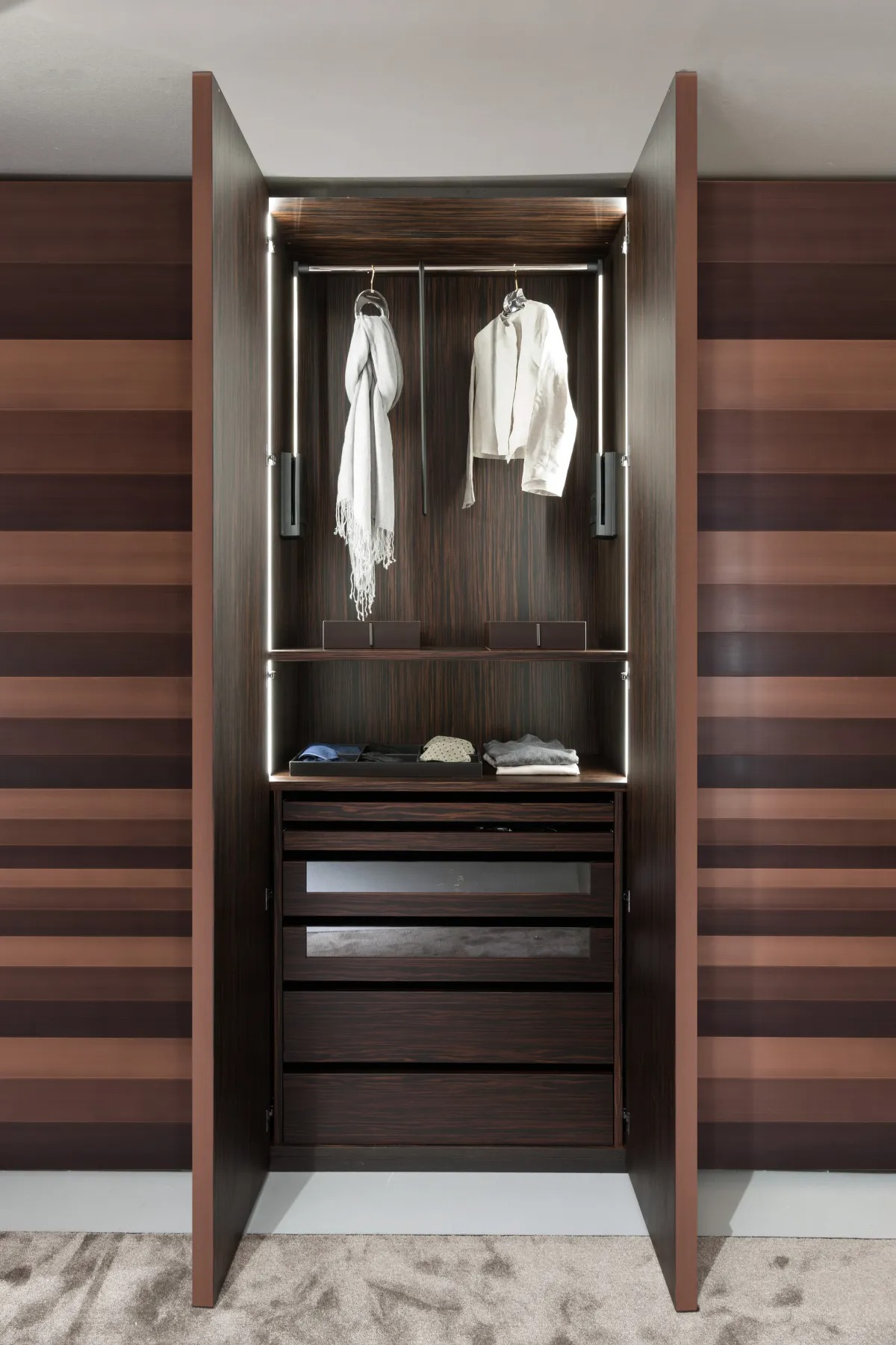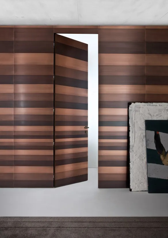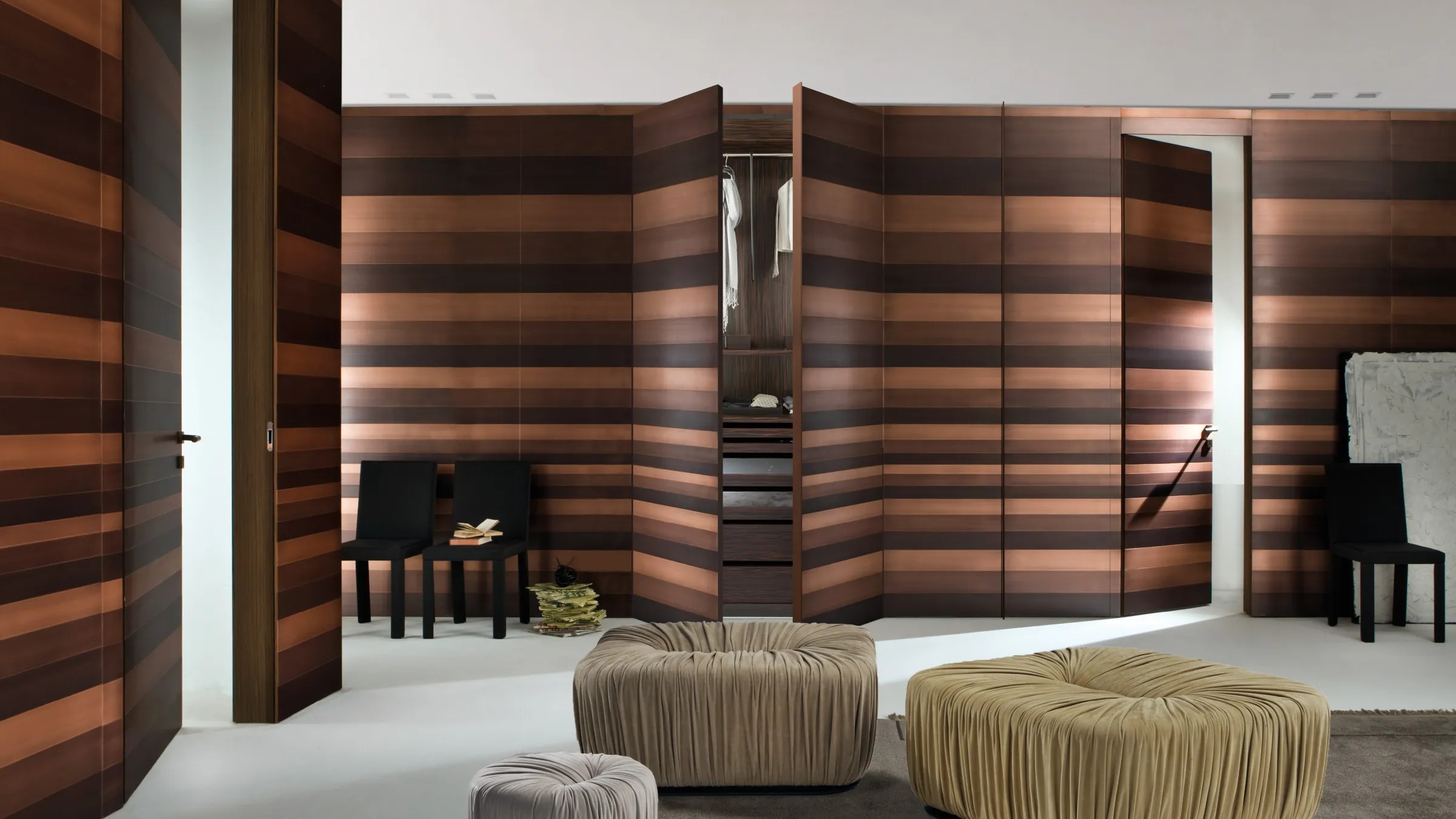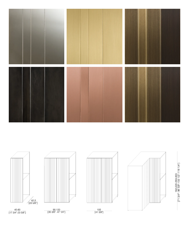 Система гардеробов на заказ с покрытием из чередующихся полос из металла, персонализируемая по размерам и отделке.