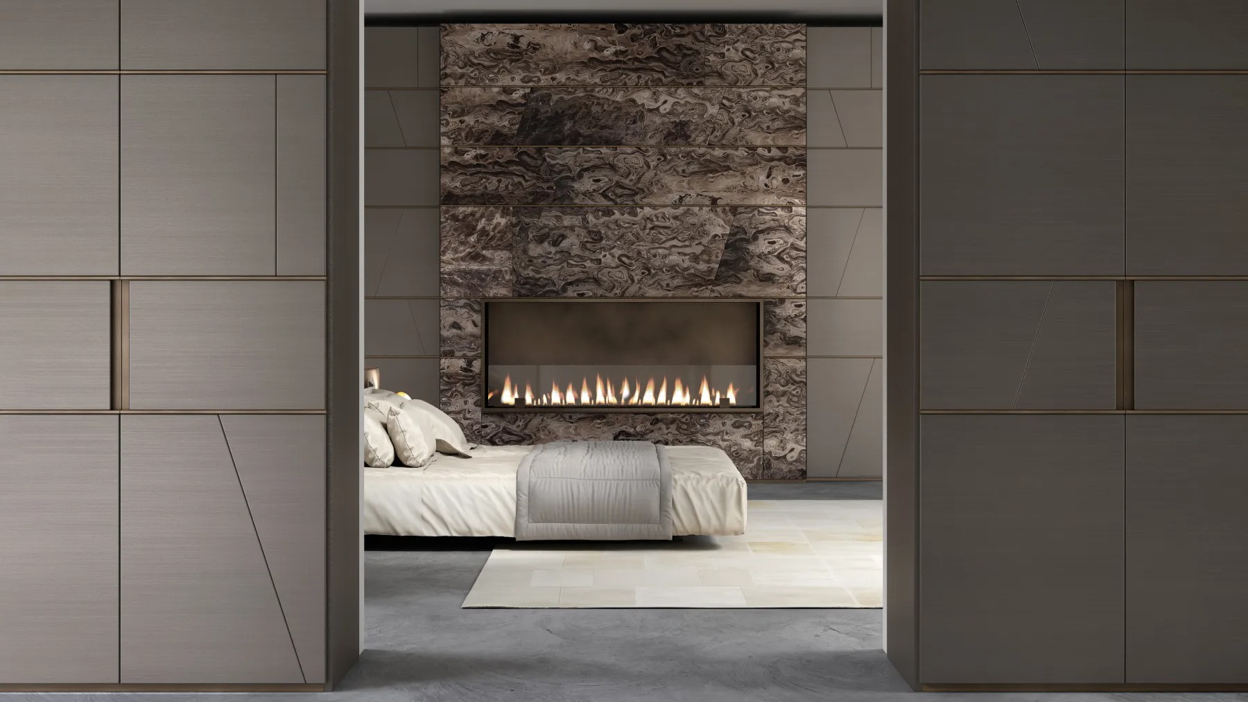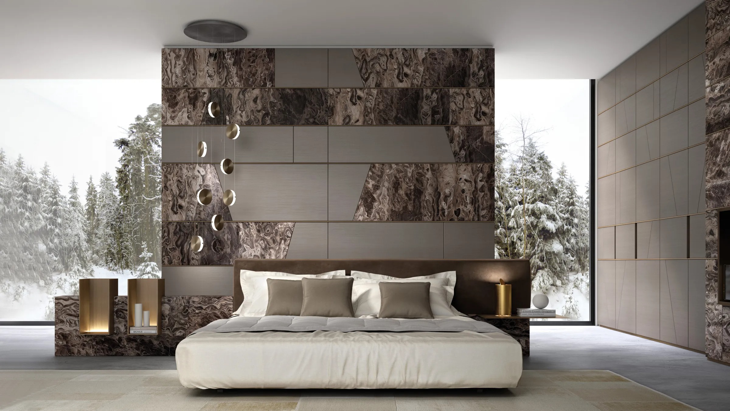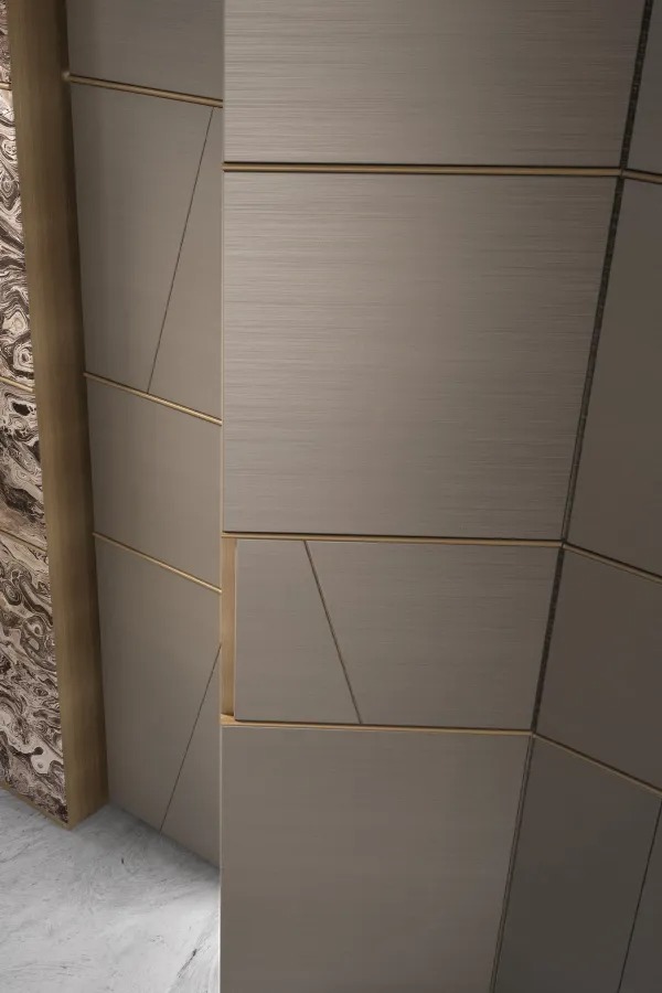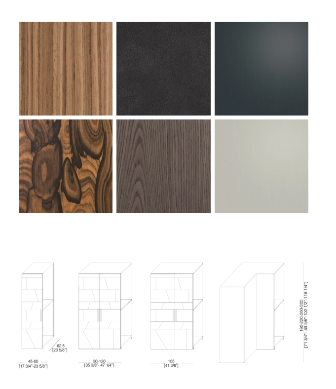 Система гардеробов, изготовляемая на заказ, с геометрическим рисунком Terre и модулями, разделенными профилями из дерева закругленного сечения, персонализруемая по размеру и отделке. Доступна на заказ с персонализируемыми аксессуарами, оборудованием и внутренней отделкой, а также со встроенным светодиодным освещением.