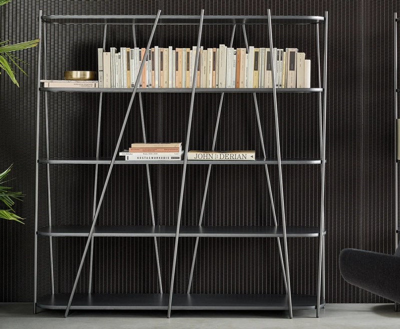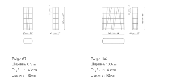 Дизайн стеллажей Twigs сочетает в себе геометрическую упорядоченность и естественную хаотичность. Порядок задается правильным ритмом деревянных полок, в то время как элемент хаотичности представлен несущей конструкцией, состоящей из тонких металлических трубчатых профилей, расположенных с неравномерным шагом и наклоном, которые напоминают заросли тростника, колеблемые ветром. Благодаря эклектичному стилю дизайна, разработанному Marconato Studio & Zappa, этот стеллаж впишется даже в самые неформальные интерьеры.