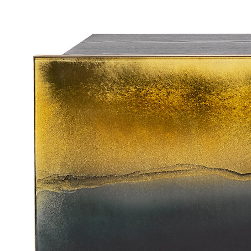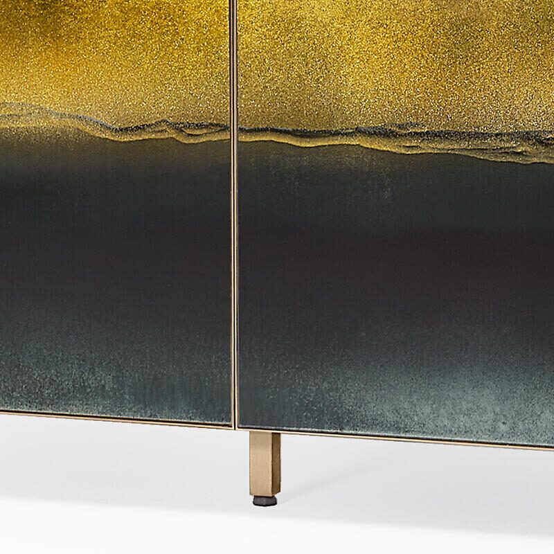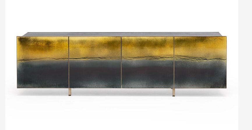 Покрытая лаком и матовым шпоном ясеня фанерная конструкция. Четыре двери, покрытые особо прозрачным стеклом, украшены отделкой Etna.