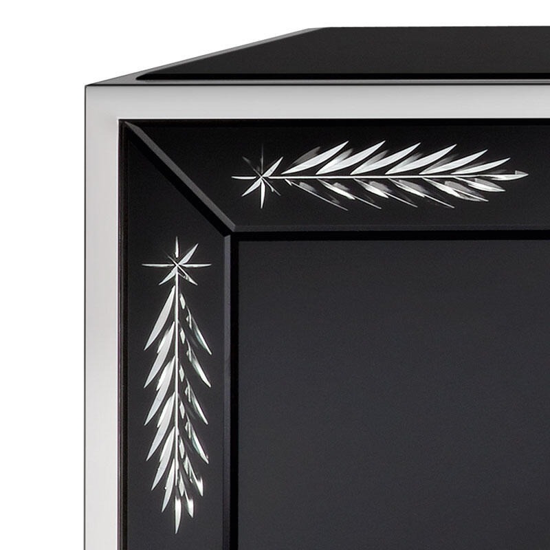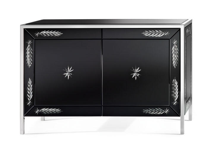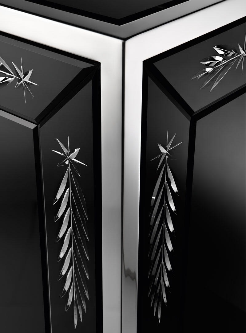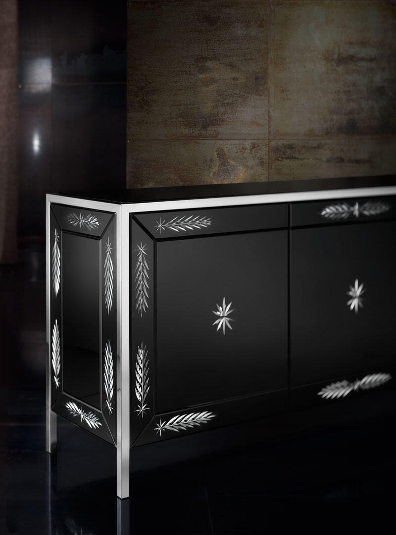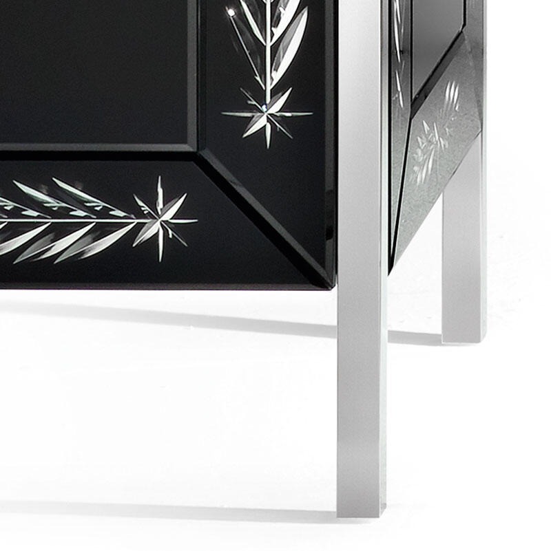 Конструкция из дерева, покрытая черным матовым лаком. Конструкция на четырех ножках из нержавеющей стали с блестящей отделкой. Две дверцы с двухтактным открыванием.