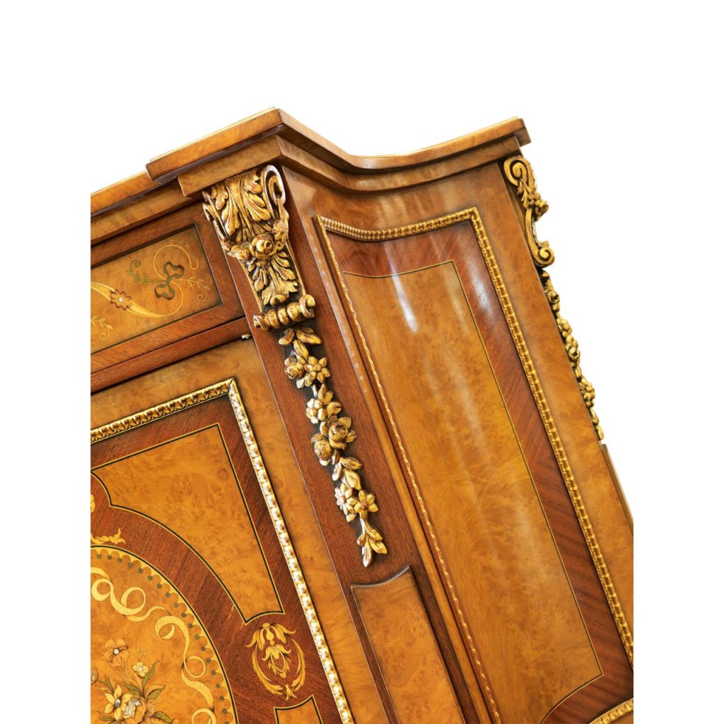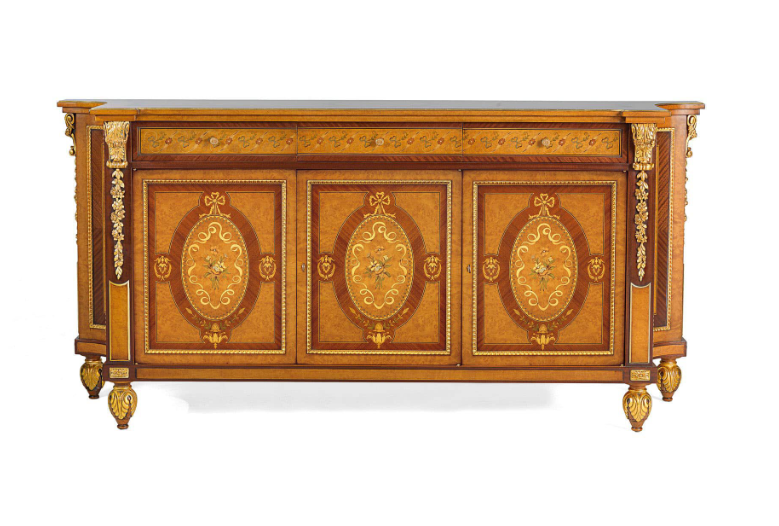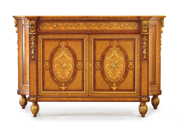 Элегантный сервант, инкрустированный миртом и красным деревом, с золотыми деталями. B / 4611-это элегантное предложение обставить гостиную, прихожую или столовую, отделанную изысканными материалами на основе старинных ремесленных технологий, передаваемых из поколения в поколение.