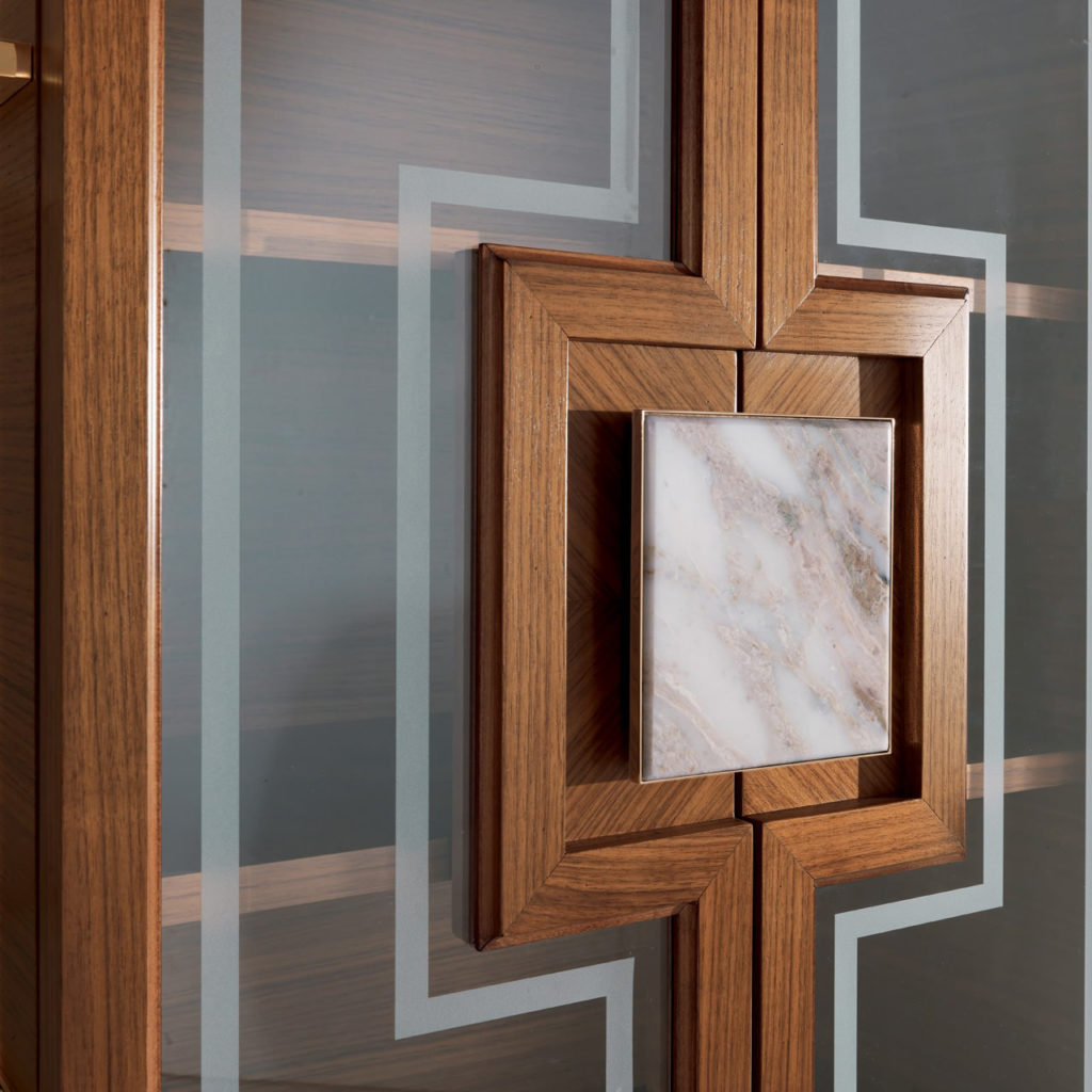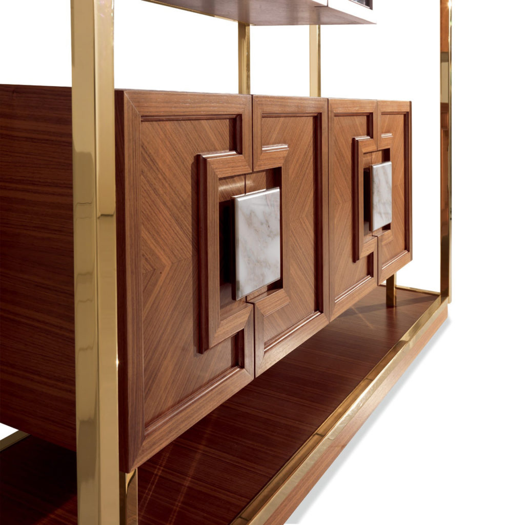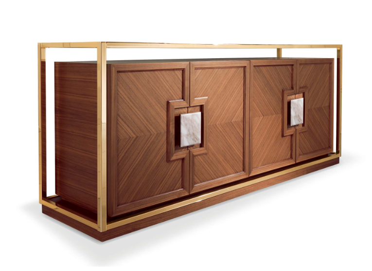 Это очаровательный сервант из ореха Каналетто, обрамленный драгоценной латунной рамой. B / 5271-это знаковый элемент со стеклянной столешницей и ручками, украшенный золотым мраморным элементом Calacatta. B / 5271 является результатом исследований и традиций, из его стиля вытекает истинный дух высококачественной мебели. Отделан изысканными материалами, основанными на старинных ремесленных методах, переданных в годы от отца к сыну. Технологически продвинутый проект с уникальной эстетикой, подчеркнутой живописными зернами дерева.