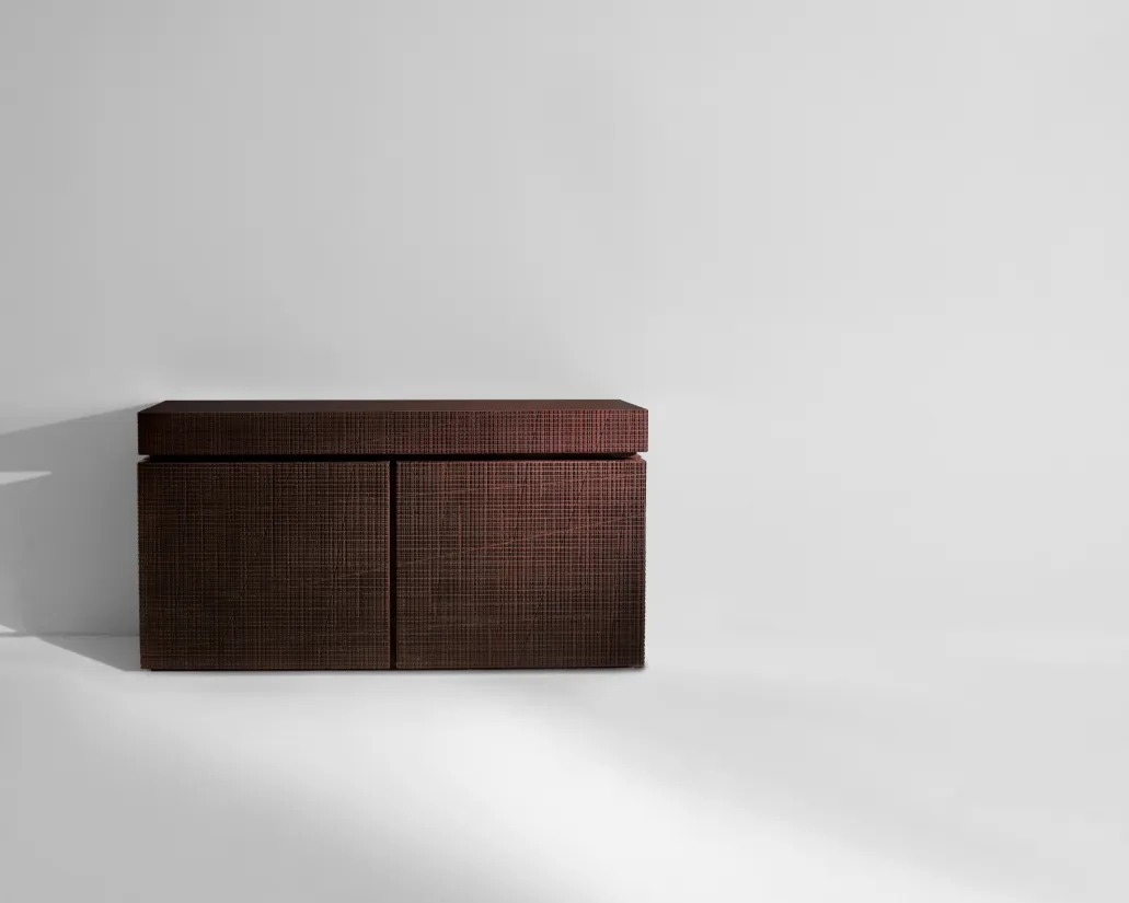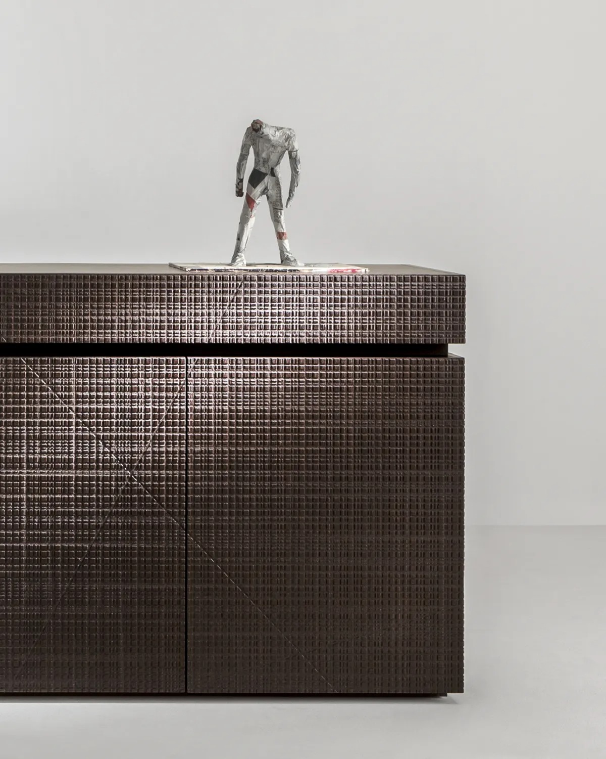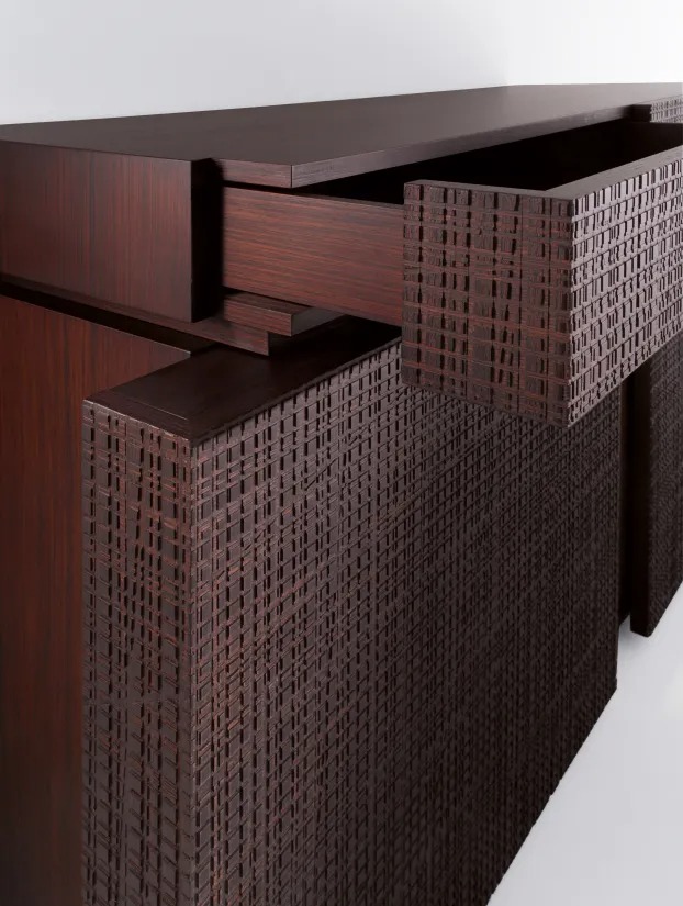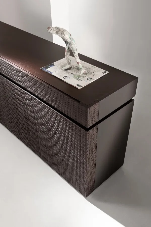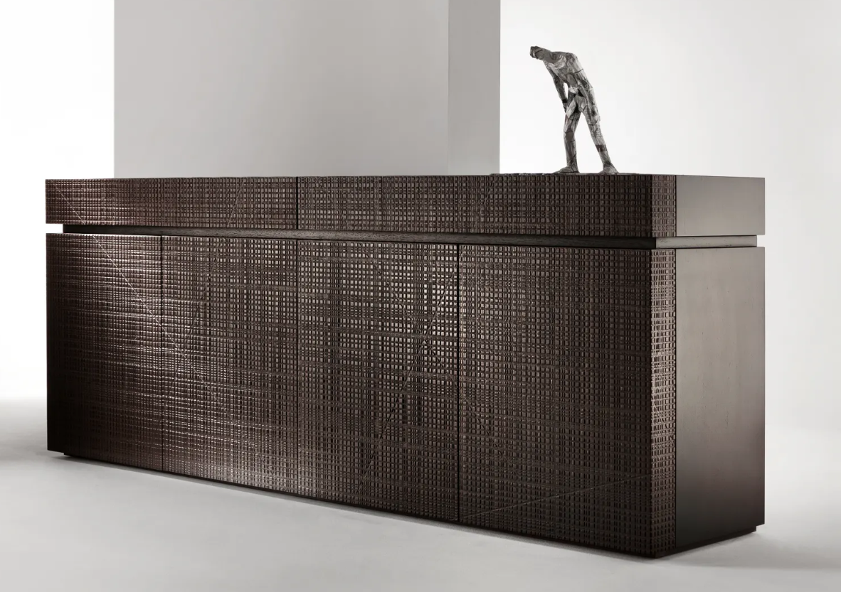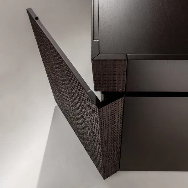 Комод из дерева с раздвижными дверцами и ящиками с резьбой Maxima оснащен внутренними полками из стекла.