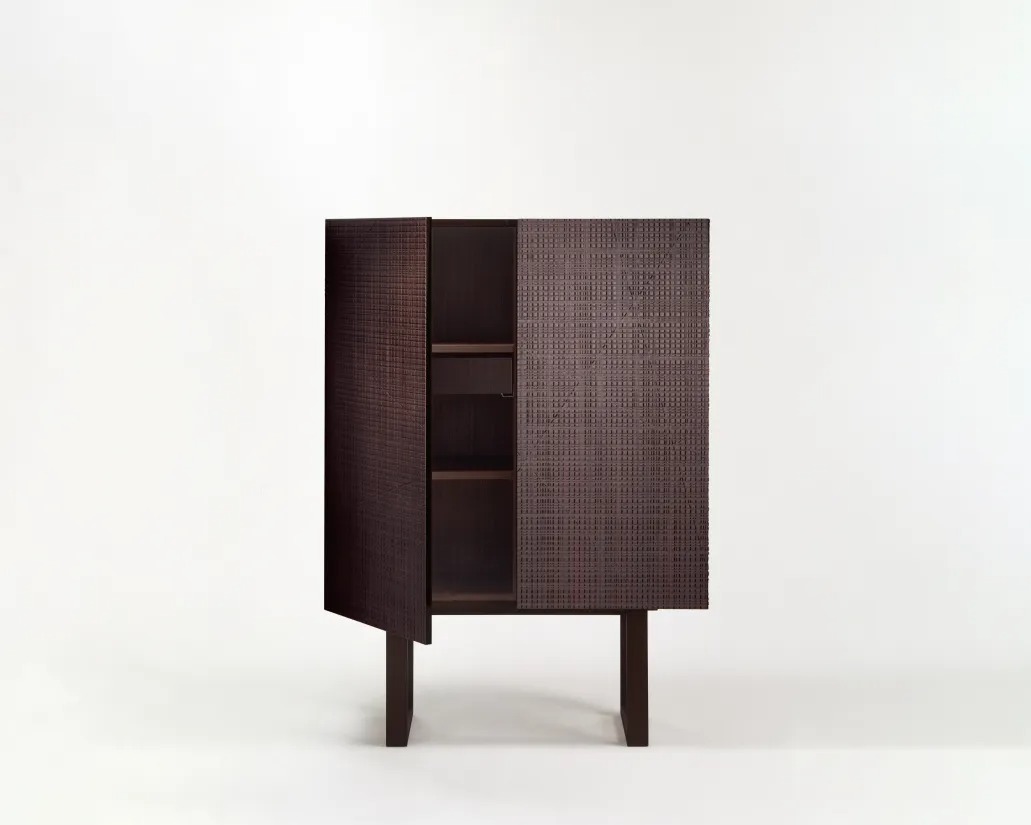 Комод из дерева с 2-мя распашными дверцами и боковинами с насечками, оснащенный 2-мя внутренними ящиками и 4-мя полками.