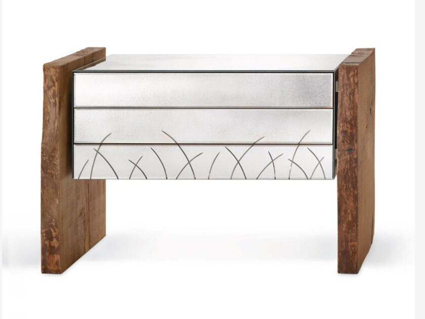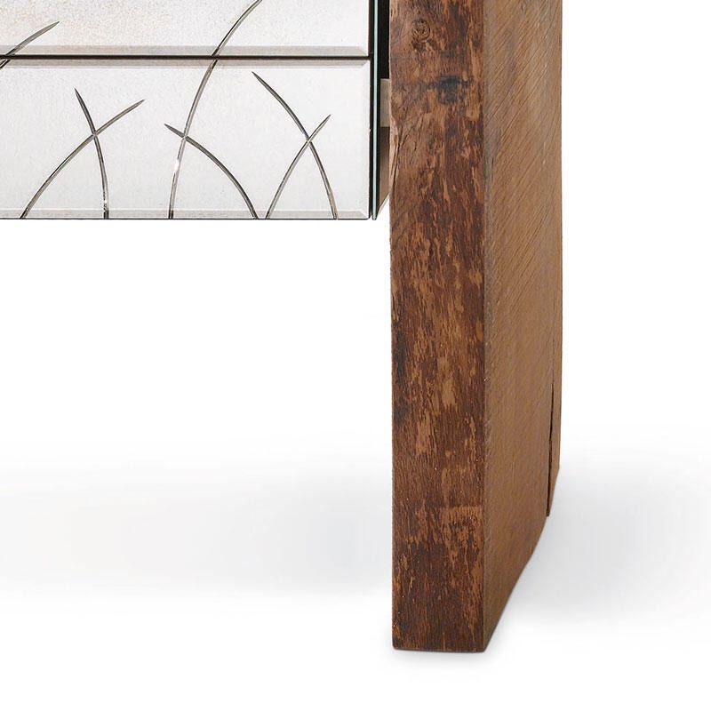 Комод с тремя выдвижными ящиками и зеркалом под старину с блестящей гравировкой ручной работы. Корпус и боковые стенки из массива дуба.