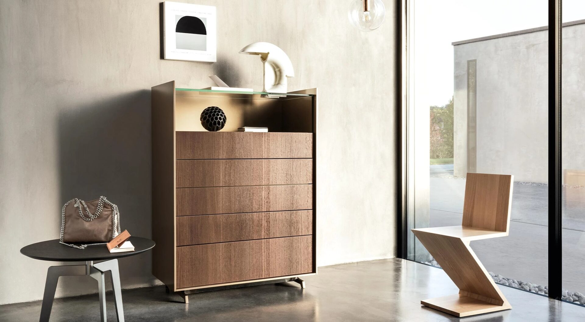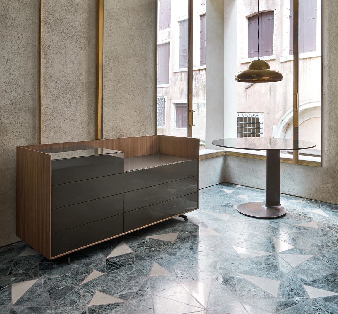 Стеклянная столешница во всю ширину, которая создает изысканный контейнер, в котором самые ценные и особые предметы приятно видны.