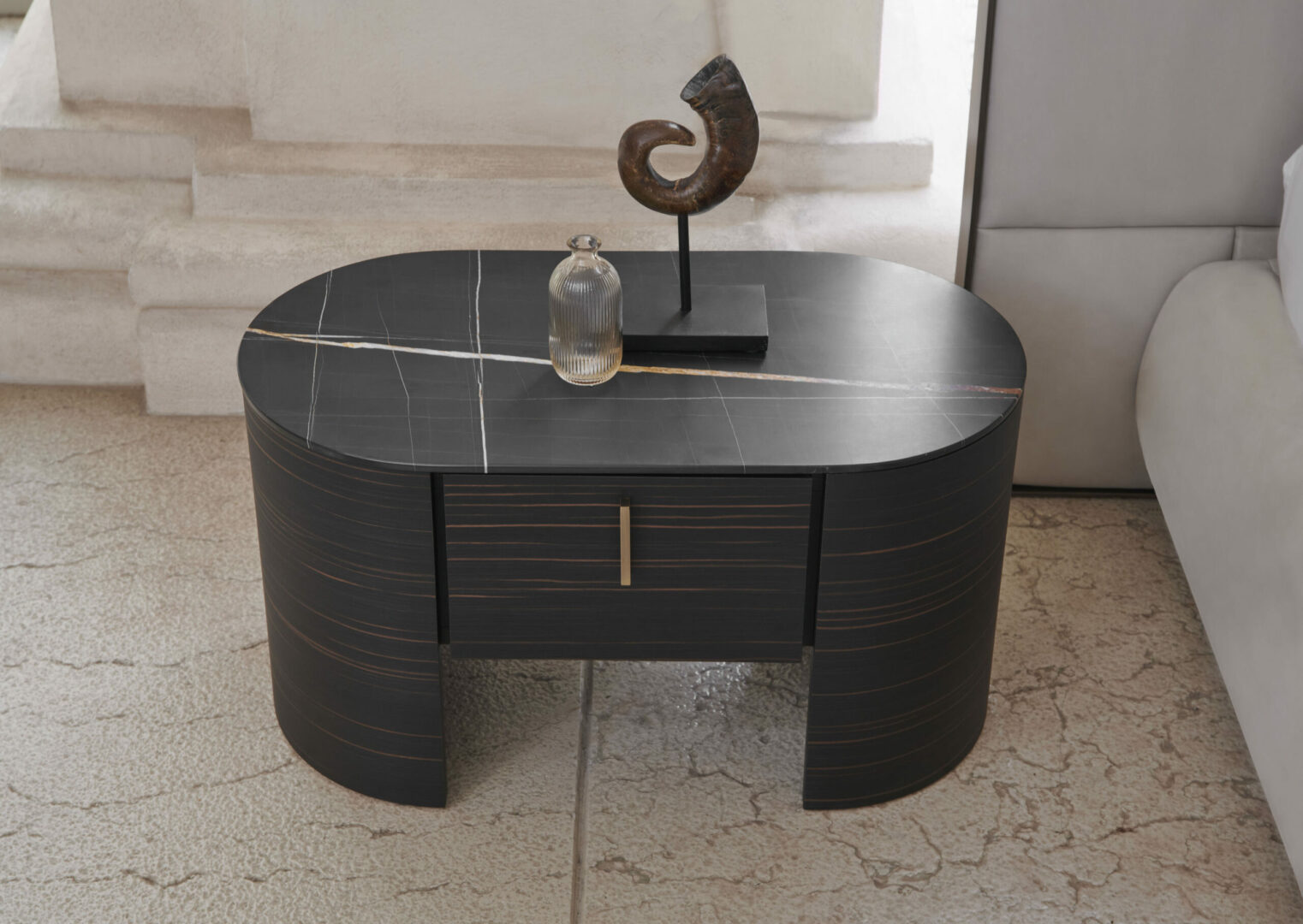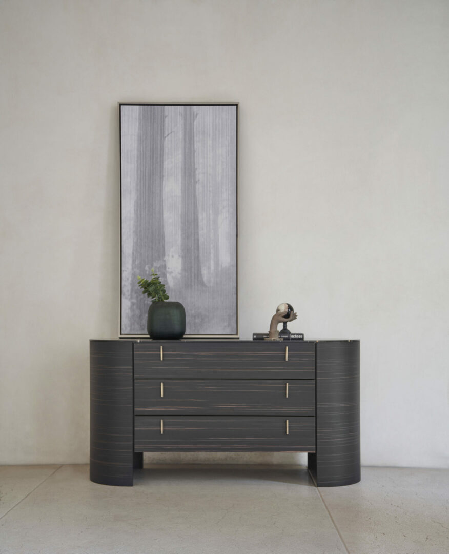 Коллекция CHARLIE отличается плавными и изящными линиями. В ее основе лежит изогнутая конструкция из массива дерева. Столешницы могут быть выполнены в различных вариантах отделки — из мрамора, стекла или дерева. Ручки выдвижных ящиков выполнены из окрашенного металла или бронзовой латуни