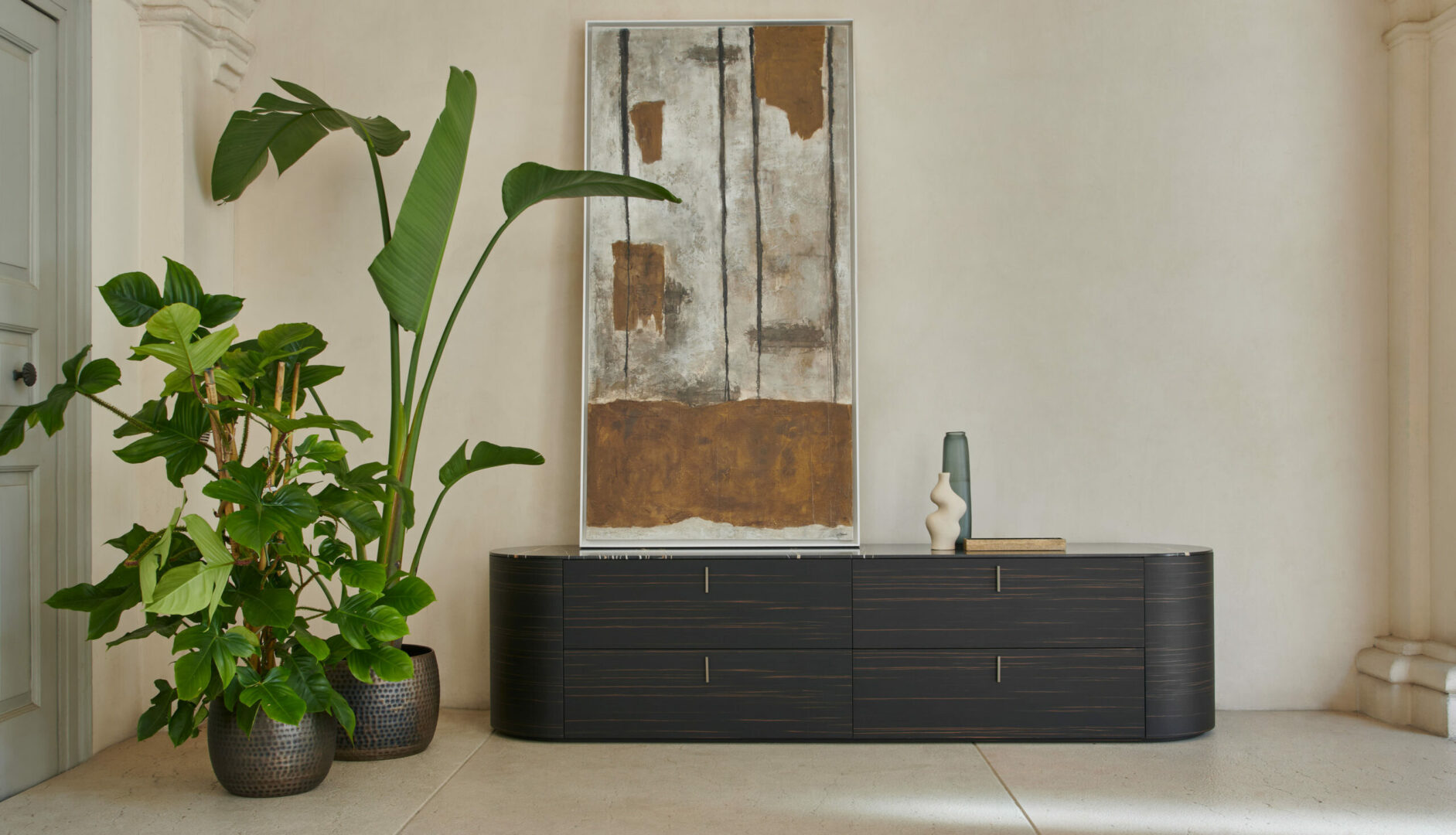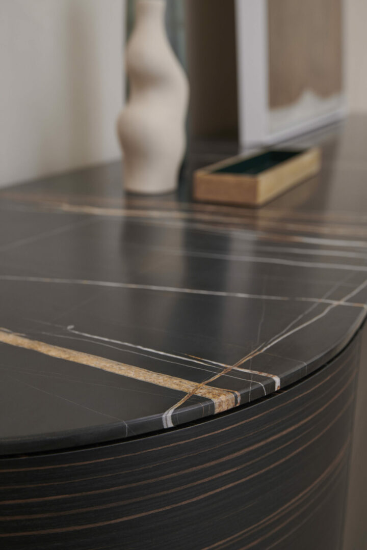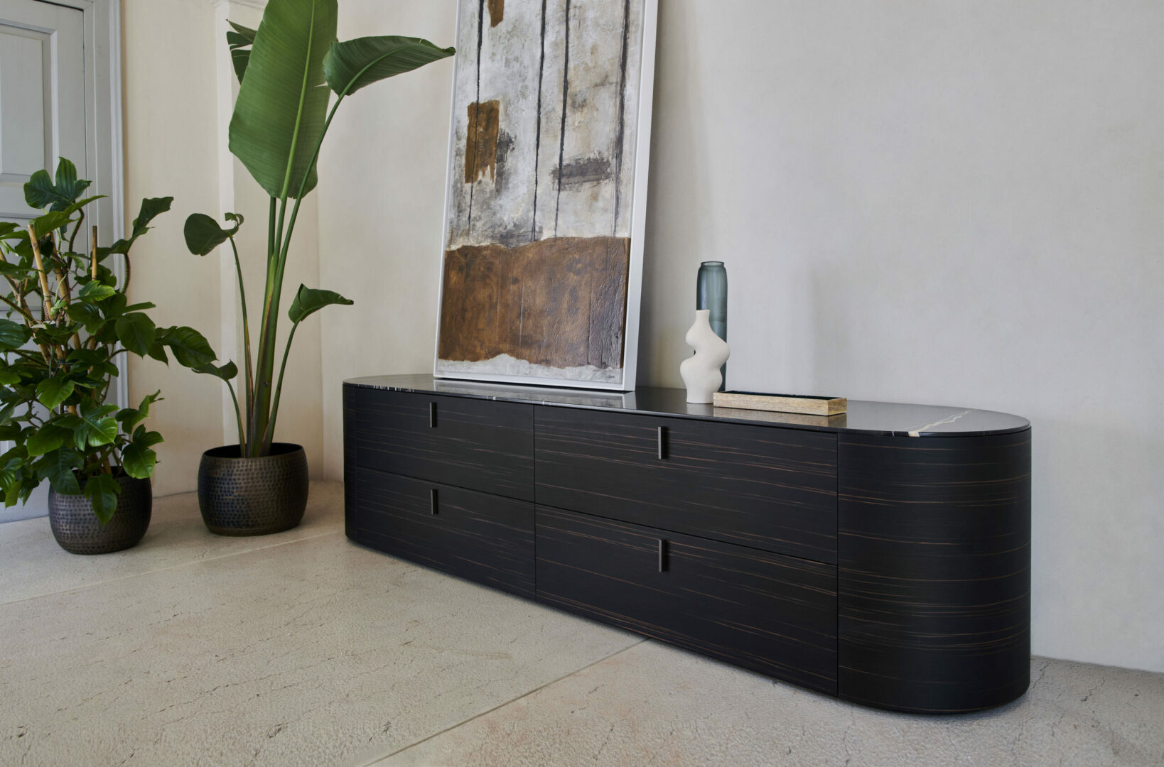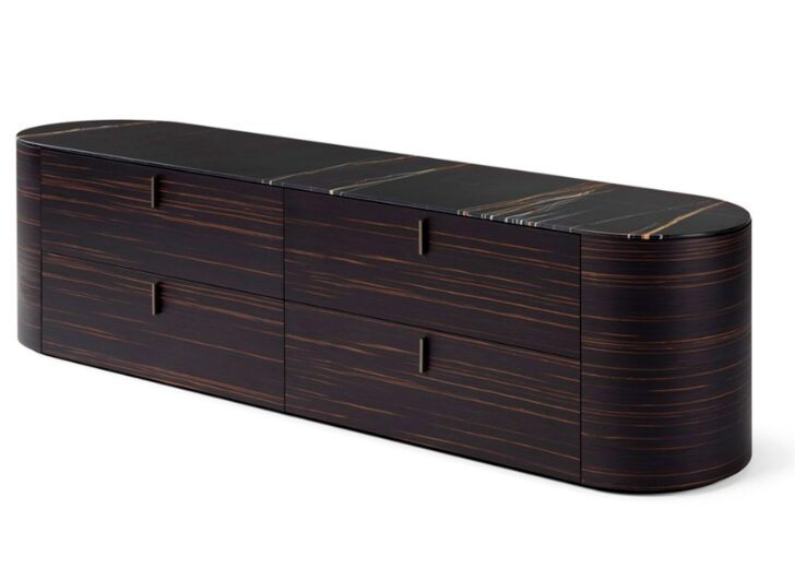 Сервант CHARLIE, спроектированный Джо Гарзоне, имеет изогнутую конструкцию из массива дерева, которая подчеркивает его формы и стиль. Столешница может быть выполнена из дерева различной фактуры или мрамора и стекла разных цветов, ручки — из металла или бронзовой латуни. Модель доступна в разных размерах.