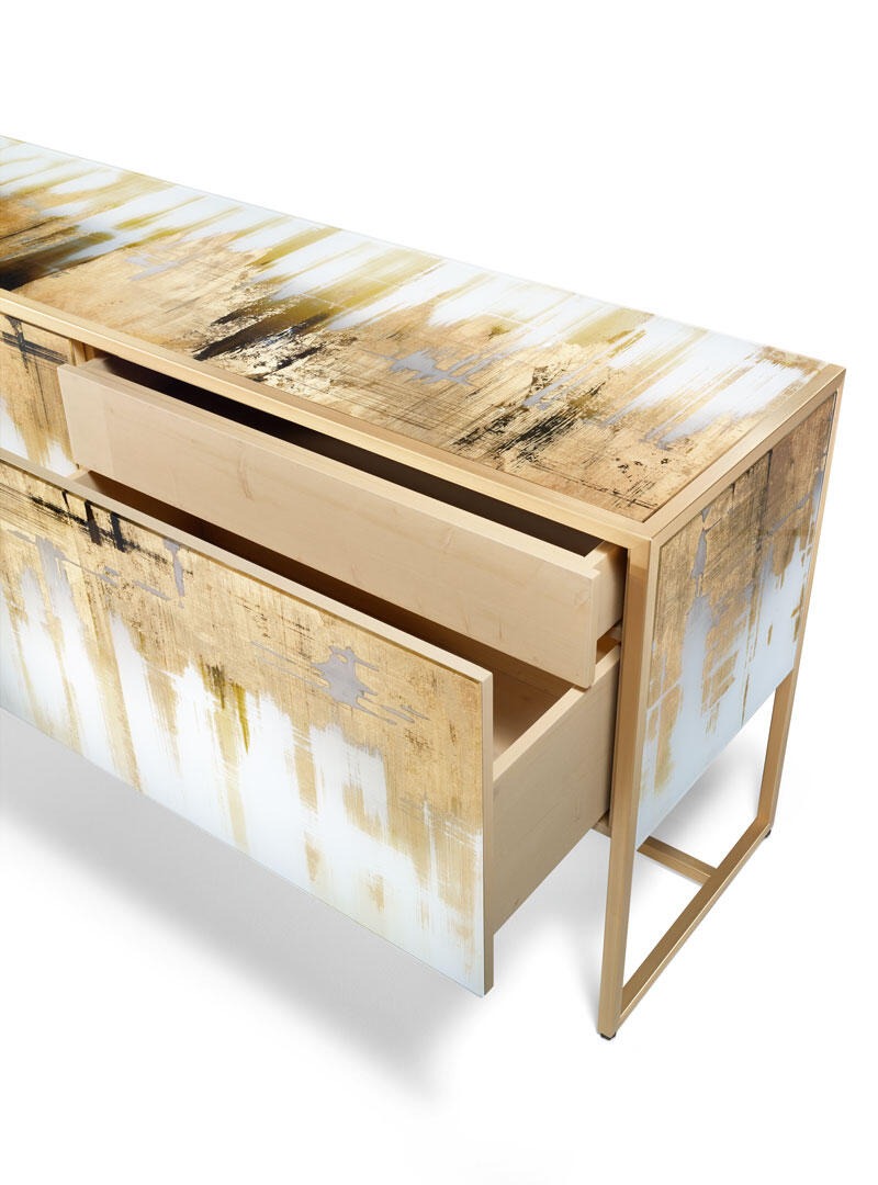 Конструкция из массива ели с матовой отделкой цвета охры. Металлическая конструкция в форме трубки с золотистой матовой отделкой.